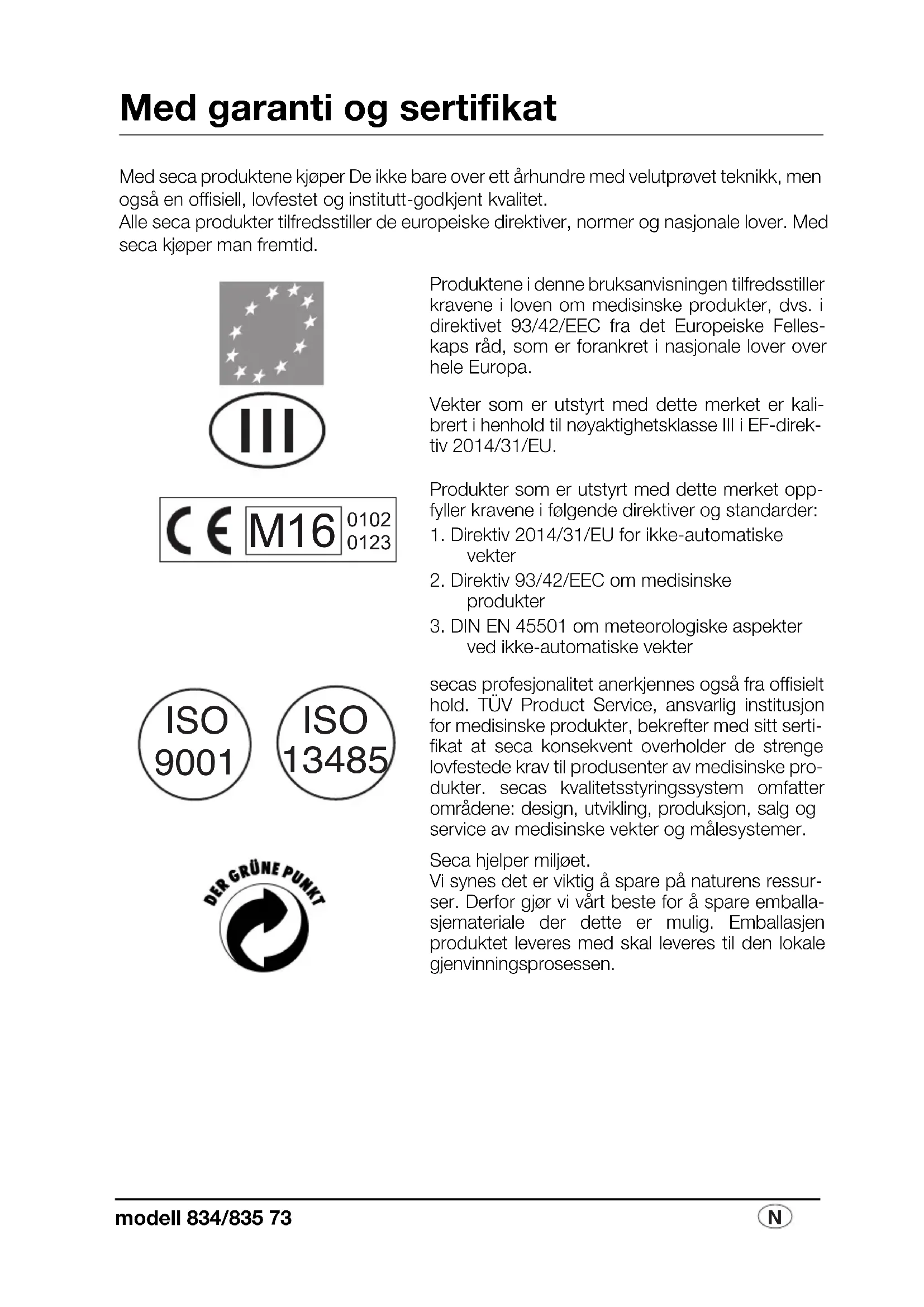 Med garanti og sertifikat Med seca produktene kjøper De ikke bare over ett århundre med velutprøvet teknikk, men også en offisiell, lovfestet og institutt-godkjent kvalitet. Alle seca produkter tilfredsstiller de europeiske direktiver, normer og nasjonale lover. Med seca kjøper man fremtid.Produktene i denne bruksanvisningen tilfredsstiller kravene i loven om medisinske produkter, dvs. i direktivet 93/42/EEC fra det Europeiske Felles-kaps råd, som er forankret i nasjonale lover over hele Europa.Vekter som er utstyrt med dette merket er kali-brert i henhold til nøyaktighetsklasse III i EF-direk-tiv 2014/31/EU. Produkter som er utstyrt med dette merket opp-fyller kravene i følgende direktiver og standarder: 1. Direktiv 2014/31/EU for ikke-automatiske vekter2. Direktiv 93/42/EEC om medisinske produkter3. DIN EN 45501 om meteorologiske aspekter ved ikke-automatiske vektersecas profesjonalitet anerkjennes også fra offisielt hold. TÜV Product Service, ansvarlig institusjon for medisinske produkter, bekrefter med sitt serti-fikat at seca konsekvent overholder de strenge lovfestede krav til produsenter av medisinske pro-dukter. secas kvalitetsstyringssystem omfatter områdene: design, utvikling, produksjon, salg og service av medisinske vekter og målesystemer.Seca hjelper miljøet. Vi synes det er viktig å spare på naturens ressur-ser. Derfor gjør vi vårt beste for å spare emballa-sjemateriale der dette er mulig. Emballasjen produktet leveres med skal leveres til den lokale gjenvinningsprosessen.