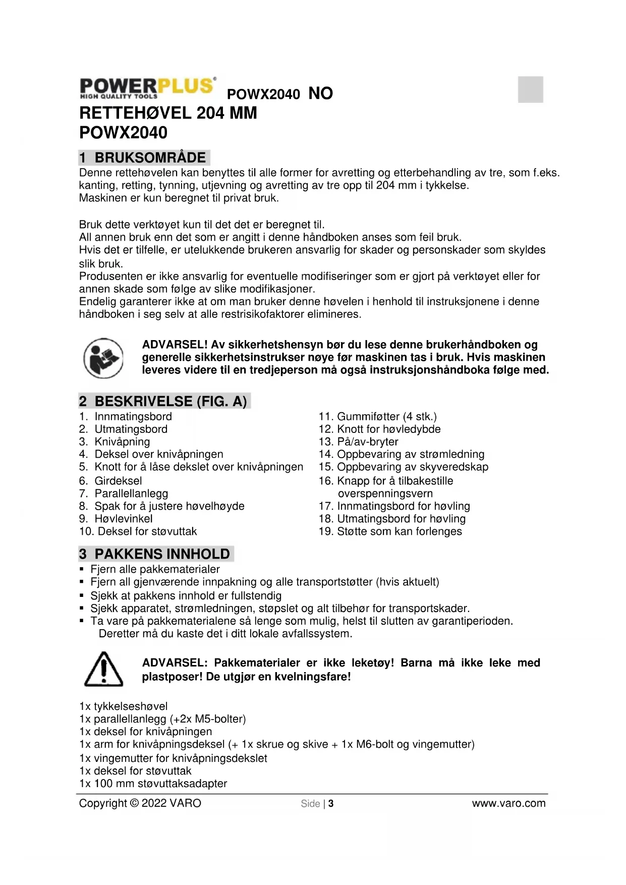 - Ta vare på pakkematerialene så lenge som mulig, helst til slutten av garantiperioden. Deretter må du kaste det i ditt lokale avfallssystem. ADVARSEL: Pakkematerialer er ikke leketøy! Barna må ikke leke med plastposer! De utgjør en kvelningsfare! 1x tykkelseshøvel 1x parallellanlegg (+2x M5-bolter) 1x deksel for knivåpningen 1x arm for knivåpningsdeksel (+ 1x skrue og skive + 1x M6-bolt og vingemutter) 1x vingemutter for knivåpningsdekslet 1x deksel for støvuttak 1x 100 mm støvuttaksadapterPOWX2040 NO Copyright © 2022 VARO Side | 4 www.varo.com 2x skyvere 1x skyveredskap 4x gummiføtter (+4x M8-bolter og skiver) 1x knivinnstillingsjigg 3x unbrakonøkler (4, 5 og 6 mm) 1x spak for å justere høvlehøyde 1x låseknott for deksel til knivåpning (+ skive) 1x håndbok Hvis du oppdager at det mangler deler eller at noen deler er skadet, må du kontakte forhandleren. 4 SYMBOLFORKLARING Følgende symboler brukes i denne bruksanvisningen eller på maskinen:
