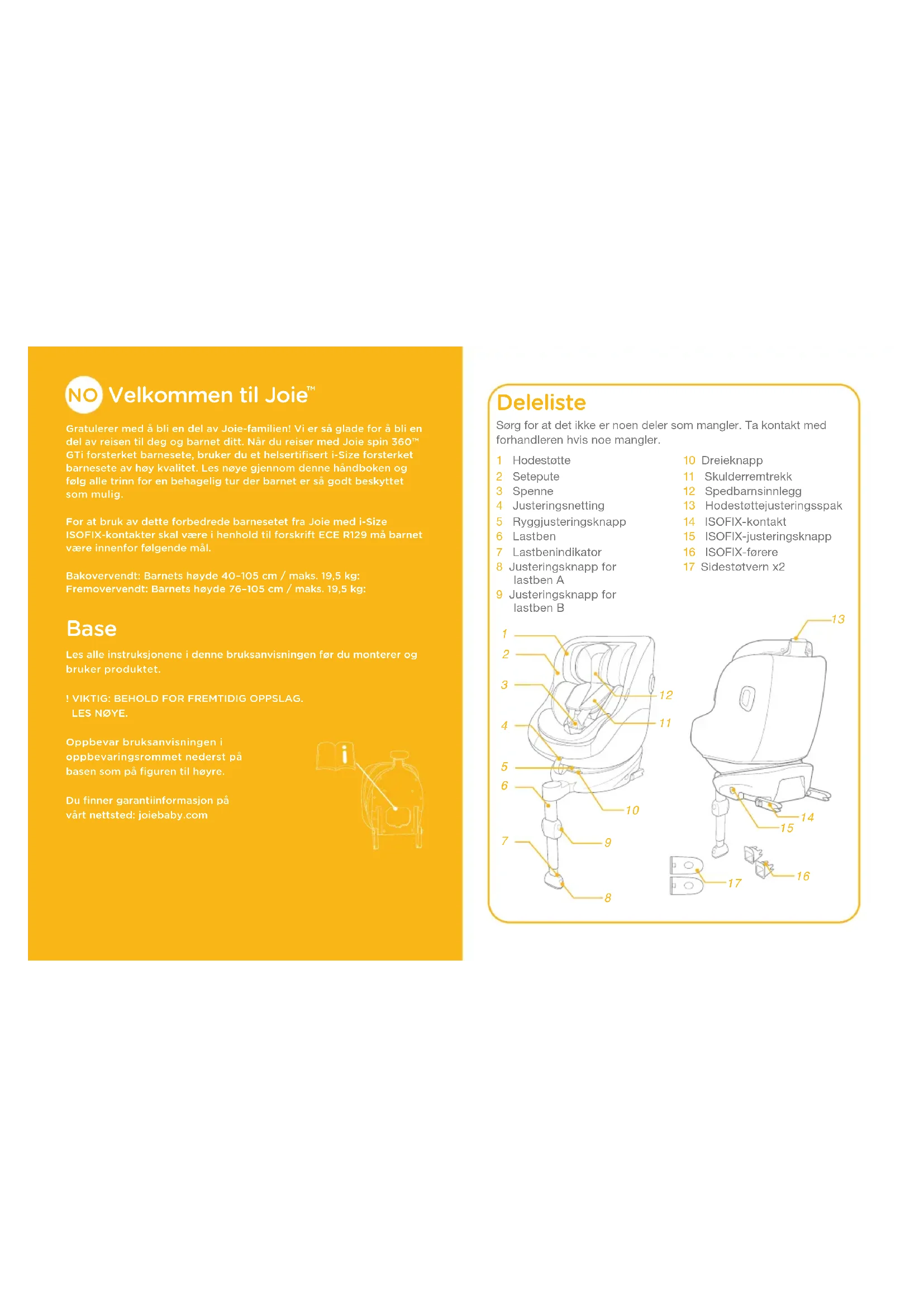 Gratulerer med å bli en del av Joie-familien! Vi er så glade for å bli en del av reisen til deg og barnet ditt. Når du reiser med Joie spin 360™ GTi forsterket barnesete, bruker du et helsertifisert i-Size forsterket barnesete av høy kvalitet. Les nøye gjennom denne håndboken og følg alle trinn for en behagelig tur der barnet er så godt beskyttet som mulig.For at bruk av dette forbedrede barnesetet fra Joie med i-Size ISOFIX-kontakter skal være i henhold til forskrift ECE R129 må barnet være innenfor følgende mål.Bakovervendt: Barnets høyde 40–105cm / maks. 19,5 kg:Fremovervendt: Barnets høyde 76–105cm / maks. 19,5 kg: Base Les alle instruksjonene i denne bruksanvisningen før du monterer og bruker produktet.! VIKTIG: BEHOLD FOR FREMTIDIG OPPSLAG.LES NØYE.Oppbevar bruksanvisningen i oppbevaringsrommet nederst på basen som på figuren til høyre.Du finner garantiinformasjon på vårt nettsted: joiebaby.com Deleliste 1 Hodestøtte2 Setepute3 Spenne4 Justeringsnetting5 Ryggjusteringsknapp6 Lastben7 Lastbenindikator8 Justeringsknapp for lastben A9 Justeringsknapp for lastben B10 Dreieknapp11 Skulderremtrekk12 Spedbarnsinnlegg13 Hodestøttejusteringsspak14 ISOFIX-kontakt15 ISOFIX-justeringsknapp16 ISOFIX-førere17 Sidestøtvern x2Sørg for at det ikke er noen deler som mangler. Ta kontakt med forhandleren hvis noe mangler.