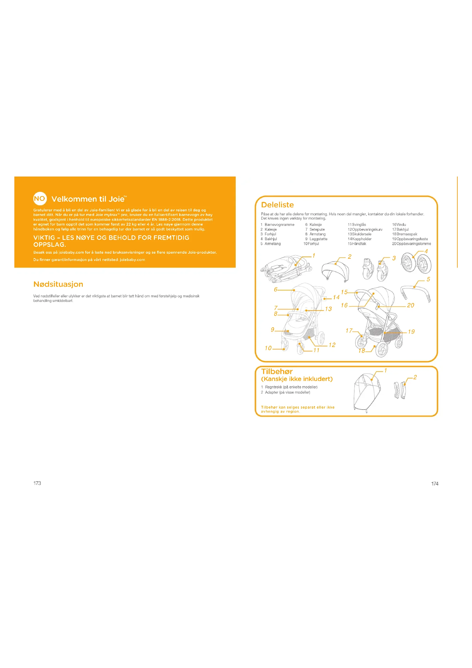 Gratulerer med å bli en del av Joie-familien! Vi er så glade for å bli en del av reisen til deg og barnet ditt. Når du er på tur med Joie mytrax™ pro, bruker du en fullsertifisert barnevogn av høy kvalitet, godkjent i henhold til europeiske sikkerhetsstandarder EN 1888-2:2018. Dette produktet er egnet for barn opptil det som kommer først av 22kg eller 4 år. Les nøye gjennom denne håndboken og følg alle trinn for en behagelig tur der barnet er så godt beskyttet som mulig. VIKTIG – LES NØYE OG BEHOLD FOR FREMTIDIG OPPSLAG. Besøk oss på joiebaby.com for å laste ned bruksanvisninger og se flere spennende Joie-produkter.Du finner garantiinformasjon på vårt nettsted: joiebaby.com Nødsituasjon Ved nødstilfeller eller ulykker er det viktigste at barnet blir tatt hånd om med førstehjelp og medisinsk behandling umiddelbart. 1 Barnevognramme 2 Kalesje 3 Forhjul 4 Bakhjul 5 Armstang 6 Kalesje 7 Setepute 8 Armstang 9 Leggstøtte 10 Forhjul 11 Svinglås 12 Oppbevaringskurv 13 Skuldersele 14 Koppholder 15 Håndtak 16 Vindu 17 Bakhjul 18 Bremsespak 19 Oppbevaringsfeste 20 Oppbevaringslomme Deleliste Påse at du har alle delene før montering. Hvis noen del mangler, kontakter du din lokale forhandler. Det kreves ingen verktøy for montering. Tilbehør (Kanskje ikke inkludert) 1 Regntrekk (på enkelte modeller)2 Adapter (på visse modeller)Tilbehør kan selges separat eller ikke avhengig av region.