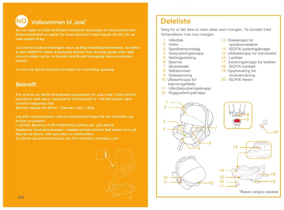 Du har kjøpt en fullt sertifisert forbedret barnesete for barnesikkerhet. Dette produktet er egnet for bruk med barn med høyde 40–85cm og vekt opptil 13kg.Les denne bruksanvisningen nøye og følg installasjonstrinnene﹐ da dette er den ENESTE måten å beskytte barnet mot alvorlig skade eller død ved en ulykke og for at barnet skal få det behagelig mens produktet brukes.Ta vare på denne bruksanvisningen for fremtidig oppslag. Bekreft For at bruk av dette forbedrede barnesetet fra Joie med i-Size ISOFIX-kontakter skal være i henhold til FN-forskrift nr. 129 må barnet være innenfor følgende mål.Barnets høyde 40-85cm / Barnets vekt 13kg;Les alle instruksjonene i denne bruksanvisningen før du monterer og bruker produktet.! VIKTIG: BEHOLD FOR FREMTIDIG OPPSLAG. LES NØYE.Oppbevar bruksanvisningen i oppbevaringsrommet bak basen som på figuren til høyre﹐ eller på siden av setetrekket.Du finner garantiinformasjon på vårt nettsted: joiebaby.com Sørg for at det ikke er noen deler som mangler. Ta kontakt med forhandleren hvis noe mangler. 1 Håndtak 2 Hette 3 Spedbarnsinnlegg 4 Selejusteringsknapp 5 Nettingjustering 6 Spenne 7 Skuldersele 8 Beltekontakt 9 Selespenning 10 Utløserknapp for barnevognfeste 11 Håndtakjusteringsknapp 12 Ryggjusteringsknapp Deleliste 13 Dreieknapp for spedbarnsbærer 14 ISOFIX-justeringsknapp 15 Utløserknapp for barnesetet 16 Lastben 17 Justeringsknapp for lastben 18 ISOFIX-kontakt 19 Oppbevaring for bruksanvisning 20 ISOFIX-førere *Basen selges separat