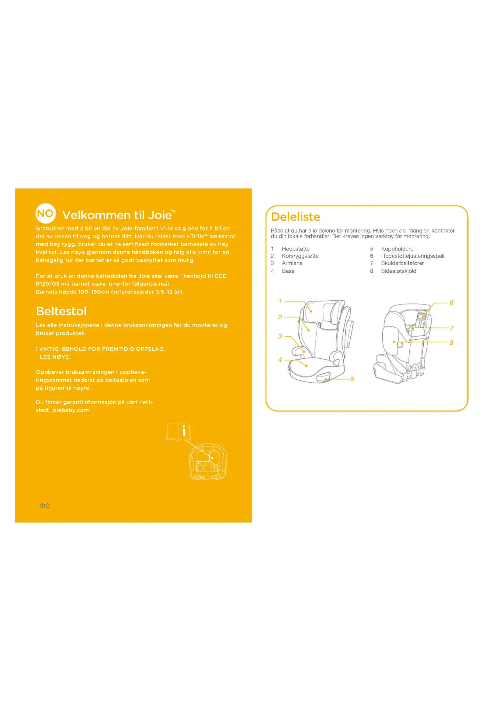 Gratulerer med å bli en del av Joie-familien! Vi er så glade for å bli en del av reisen til deg og barnet ditt. Når du reiser med i-Trillo™ beltestol med høy rygg, bruker du et helsertifisert forsterket barnesete av høy kvalitet. Les nøye gjennom denne håndboken og følg alle trinn for en behagelig tur der barnet er så godt beskyttet som mulig.For at bruk av denne beltestolen fra Joie skal være i henhold til ECE R129/03 må barnet være innenfor følgende mål.Barnets høyde 100–150cm (referansealder 3,5–12 år). Beltestol Les alle instruksjonene i denne bruksanvisningen før du monterer og bruker produktet.! VIKTIG: BEHOLD FOR FREMTIDIG OPPSLAG.LES NØYE.Oppbevar bruksanvisningen i oppbeva-ringsrommet nederst på beltestolen som på figuren til høyre.Du finner garantiinformasjon på vårt nett-sted: joiebaby.com