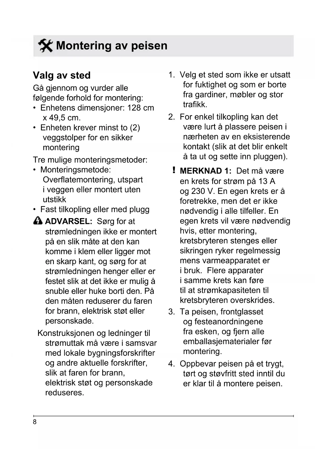 være lurt å plassere peisen i nærheten av en eksisterende kontakt (slik at det blir enkelt å ta ut og sette inn pluggen).