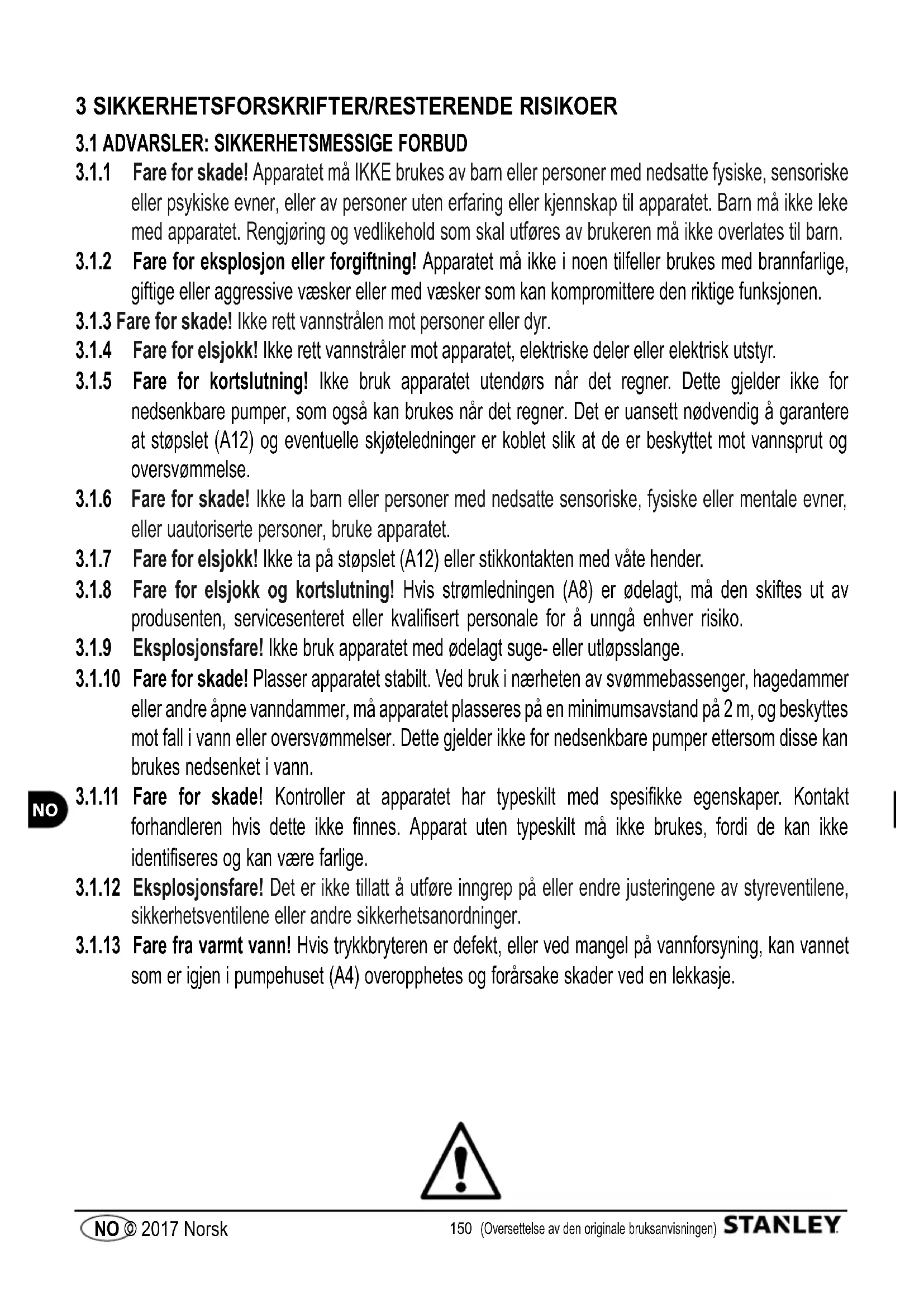 Følg informasjonen på etikettene festet til apparatet. Kontroller at de alltid finnes og er lesbare. I motsatt tilfelle må det festes nye på samme plass. Advarsel – fare Les disse instruksjonene nøye før bruk. Ikon E1. Apparatet må ikke kastes sammen med vanlig husholdningsavfall, men kan leveres inn til forhandleren ved kjøp av et nytt apparat. De elektriske og elektroniske delene i apparatet må ikke brukes om igjen til utilbørlig formål, fordi de kan være helseskadelige. Ikon E3. Angir at apparatet er ment til hjemmebruk.149 (Oversettelse av den originale bruksanvisningen) NO © 2017 Norsk