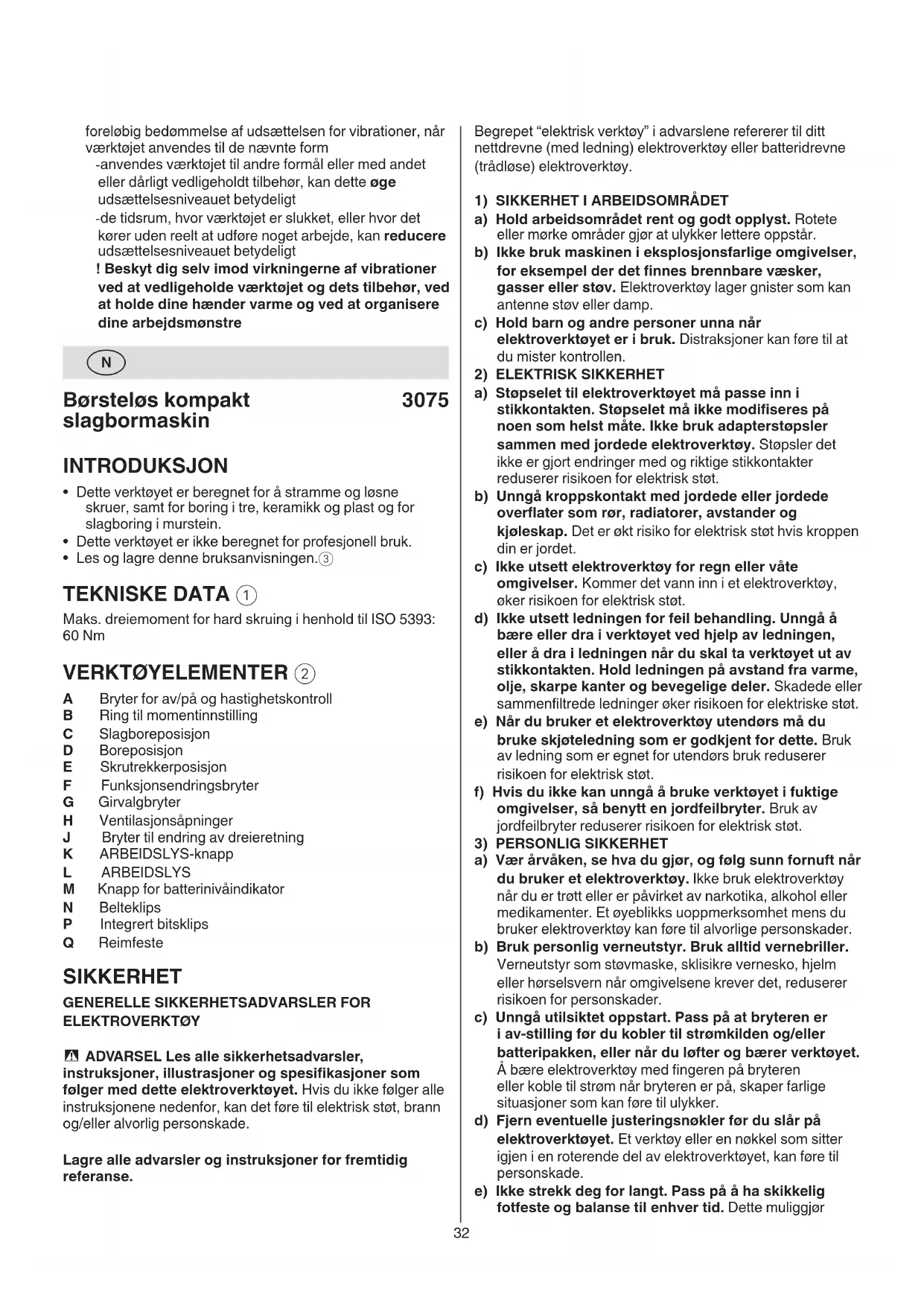 - Les og lagre denne bruksanvisningen.3 TEKNISKE DATA 1 Maks. dreiemoment for hard skruing i henhold til ISO 5393: 60 Nm VERKTØYELEMENTER 2 A Bryter for av/på og hastighetskontroll B Ring til momentinnstilling C Slagboreposisjon D Boreposisjon E Skrutrekkerposisjon F Funksjonsendringsbryter G Girvalgbryter H Ventilasjonsåpninger