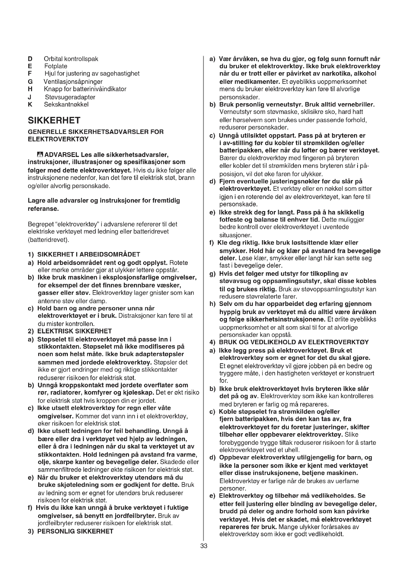 a) Ikke legg press på elektroverktøyet. Bruk et elektroverktøy som er egnet for det du skal gjøre. Et egnet elektroverktøy vil gjøre jobben på en bedre og tryggere måte, i den hastigheten verktøyet er konstruert for. b) Ikke bruk elektroverktøyet hvis bryteren ikke slår det på og av. Elektroverktøy som ikke kan kontrolleres med bryteren er farlig og må repareres. c) Koble støpselet fra strømkilden og/eller fjern batteripakken, hvis den kan tas av, fra elektroverktøyet før du foretar justeringer, skifter tilbehør eller oppbevarer elektroverktøy. Slike forebyggende trygge tiltak reduserer risikoen for å starte elektroverktøyet ved et uhell. d) Oppbevar elektroverktøy utilgjengelig for barn, og ikke la personer som ikke er kjent med verktøyet eller disse instruksjonene, betjene maskinen. Elektroverktøy er farlige når de brukes av uerfarne personer. e) Elektroverktøy og tilbehør må vedlikeholdes. Se etter feil justering eller binding av bevegelige deler, brudd på deler og andre forhold som kan påvirke verktøyet. Hvis det er skadet, må elektroverktøyet repareres før bruk. Mange ulykker forårsakes av elektroverktøy som ikke er godt vedlikeholdt. D Orbital kontrollspak E Fotplate F Hjul for justering av sagehastighet G Ventilasjonsåpninger H Knapp for batterinivåindikator