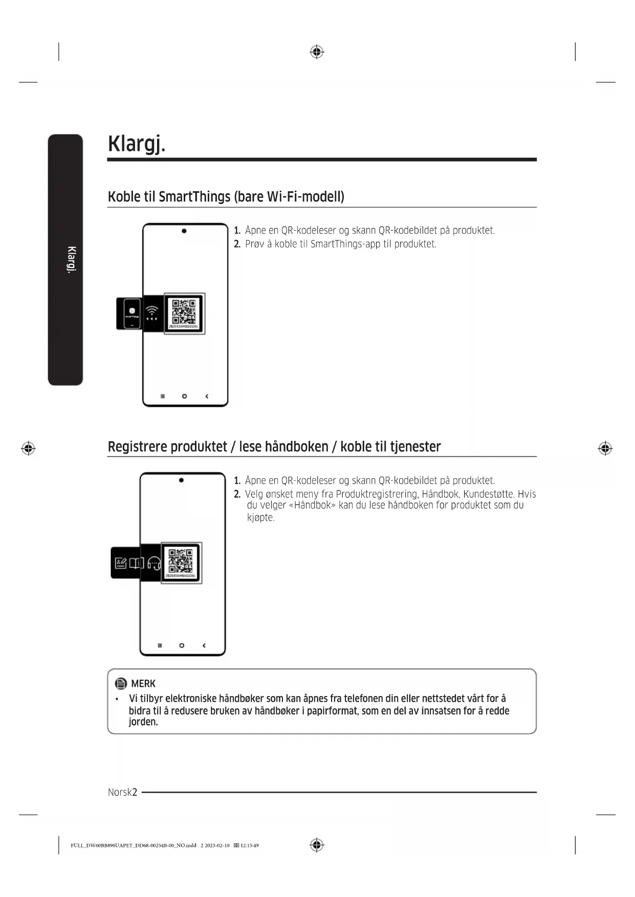 - Vi tilbyr elektroniske håndbøker som kan åpnes fra telefonen din eller nettstedet vårt for å bidra til å redusere bruken av håndbøker i papirformat, som en del av innsatsen for å redde jorden. FULL_DW60BB890UAPET_DD68-00254B-00_NO.indd 2 2023-02-10 12:15:49Norsk 3 Innhold Innhold Sikkerhetsinformasjon 5 Det du trenger å vite om sikkerhetsinstruksjoner 5 Viktige sikkerhetssymboler 5 Instruksjoner om WEEE 6 Viktige sikkerhetsforholdsregler 7 Instruksjoner når du bruker oppvaskmaskinen 9 Instruksjoner for å beskytte barn 10 Instruksjoner for å installere oppvaskmaskinen 10 Installasjon 13 Pakken inneholder 13 Installasjonskrav 17 Innebygd installasjon under vasken (for frittstående modell) 19 Trinnvis installasjon 20 Dimensjon på utkutt 21 Gulvlist 30 SmartThings (bare for aktuelle modeller) 32 Åpen kildekode-kunngjøring 35 Før du starter 36 Overblikk over oppvaskmaskinen 36 Gjenstander som ikke egner seg i oppvaskmaskinen 37 Grunnleggende bruk av skuffene 38 Beholder for oppvaskmiddel 42 Skyllemiddelbeholder 44 Saltbeholder 45 Innstillinger 46 Innstillinger (unntatt modellene DW60BB89*) 49 Funksjoner 52 Kontrollpanel (for modellene DW60BB89*) 52 Kontrollpanel (bortsett for modellene DW60BB89*) 53 Programoversikt 54 Enkle trinn for oppstart 56 Vedlikehold 57 Rengjøring 57 Rengjøre dreneringspumpen 61 Langtidsvedlikehold 61 FULL_DW60BB890UAPET_DD68-00254B-00_NO.indd 3 2023-02-10 12:15:49Norsk4 InnholdInnhold Feilsøking 62 Kontrollpunkter 62 Informasjonskoder 65 Programtabell 66 Vedlegg 70 Transportering/ytting 70 Beskyttelse mot frost 70 Avhending av oppvaskmaskinen og støtting av miljøet 70 Energisparingstips 71 EPREL-informasjon 71 Spesikasjoner 72 For standardtest 73 FULL_DW60BB890UAPET_DD68-00254B-00_NO.indd 4 2023-02-10 12:15:49Norsk 5 Sikkerhetsinformasjon Sikkerhetsinformasjon Gratulerer med din nye oppvaskmaskin fra Samsung. Denne brukerhåndboken inneholder viktig informasjon om installasjon, bruk og vedlikehold av apparatet. Ta deg tid til å lese denne brukerhåndboken for å få fullt utbytte av oppvaskmaskinens mange fordeler og funksjoner. Det du trenger å vite om sikkerhetsinstruksjoner Les denne håndboken nøye for å sikre at du vet hvordan du trygt og effektivt skal bruke de omfattende funksjonene til det nye apparatet, og ta vare på håndboken på et trygt sted i nærheten av apparatet til fremtidig referanse. Bruk dette apparatet kun til sitt tiltenkte formål som beskrevet i denne brukerhåndboken. Advarsler og viktige sikkerhetsinstruksjoner i denne brukerhåndboken dekker ikke alle mulige omstendigheter og situasjoner som kan oppstå. Det er ditt ansvar å bruke sunn fornuft og være varsom og nøyaktig når du installerer, vedlikeholder og bruker oppvaskmaskinen. Siden disse følgende bruksinstruksjonene dekker forskjellige modeller, kan kjennetegnene til din oppvaskmaskin variere noe fra de som beskrives i denne håndboken, og det er ikke sikkert at alle varseltegnene gjelder. Hvis du har spørsmål eller bekymringer, kontakter du ditt nærmeste servicesenter eller nner hjelp og informasjon online på www.samsung.com. Viktige sikkerhetssymboler Betydningen av ikonene og tegnene i denne bruksanvisningen: ADVARSEL Farer eller usikker bruk som kan føre til alvorlig personskade, død eller materiell skade. FORSIKTIG Farer eller usikker bruk som kan føre til personskade eller materiell skade. MERK Indikerer at det er fare for personskade eller materiell skade. Disse varselssymbolene er her for å hindre at du eller andre blir skadet. Følg dem eksplisitt. Ta vare på disse instruksjonene på et trygt sted og sørg for at nye brukere er kjent med innholdet. Gi dem videre til en eventuell ny eier. FULL_DW60BB890UAPET_DD68-00254B-00_NO.indd 5 2023-02-10 12:15:50Norsk6 Sikkerhetsinformasjon Sikkerhetsinformasjon Instruksjoner om WEEE Korrekt avhending av dette produktet (Avfall fra elektrisk og elektronisk utstyr) (Gjelder i land med avfallssortering) Denne merkingen som vises på produktet, dets tilbehør eller dokumentasjon, indikerer at produktet eller det elektroniske tilbehøret (for eksempel lader, headset, USB-kabel) ikke skal kastes sammen med annet husholdningsavfall ved slutten av levetiden. For å hindre potensiell skade på miljøet eller helseskader grunnet ukontrollert avfallsavhending ber vi om at dette avfallet holdes adskilt fra andre typer avfall og resirkuleres på ansvarlig måte for å fremme bærekraftig gjenbruk av materielle ressurser. Private forbrukere bør kontakte enten forhandleren de kjøpte produktet av, eller lokale myndigheter for detaljer om hvor og hvordan disse artiklene kan resirkuleres på en miljøvennlig måte. Forretningsbrukere bør kontakte sin leverandør og undersøke vilkårene i kjøpskontrakten. Dette produktet og det elektroniske tilbehøret skal ikke blandes med annet kommersielt avfall som skal kastes. Ønsker du informasjon om Samsungs miljøengasjement og produktspesikke lovpålagte forpliktelser, for eksempel REACH, WEEE, kan du gå til siden vår for bærekraftighet gjennom Samsung.com FULL_DW60BB890UAPET_DD68-00254B-00_NO.indd 6 2023-02-10 12:15:50Norsk 7 Sikkerhetsinformasjon Viktige sikkerhetsforholdsregler For å redusere risiko for brann, elektrisk støt eller personskade ved bruk av apparatet bør det ta visse grunnleggende forholdsregler, inkludert følgende: