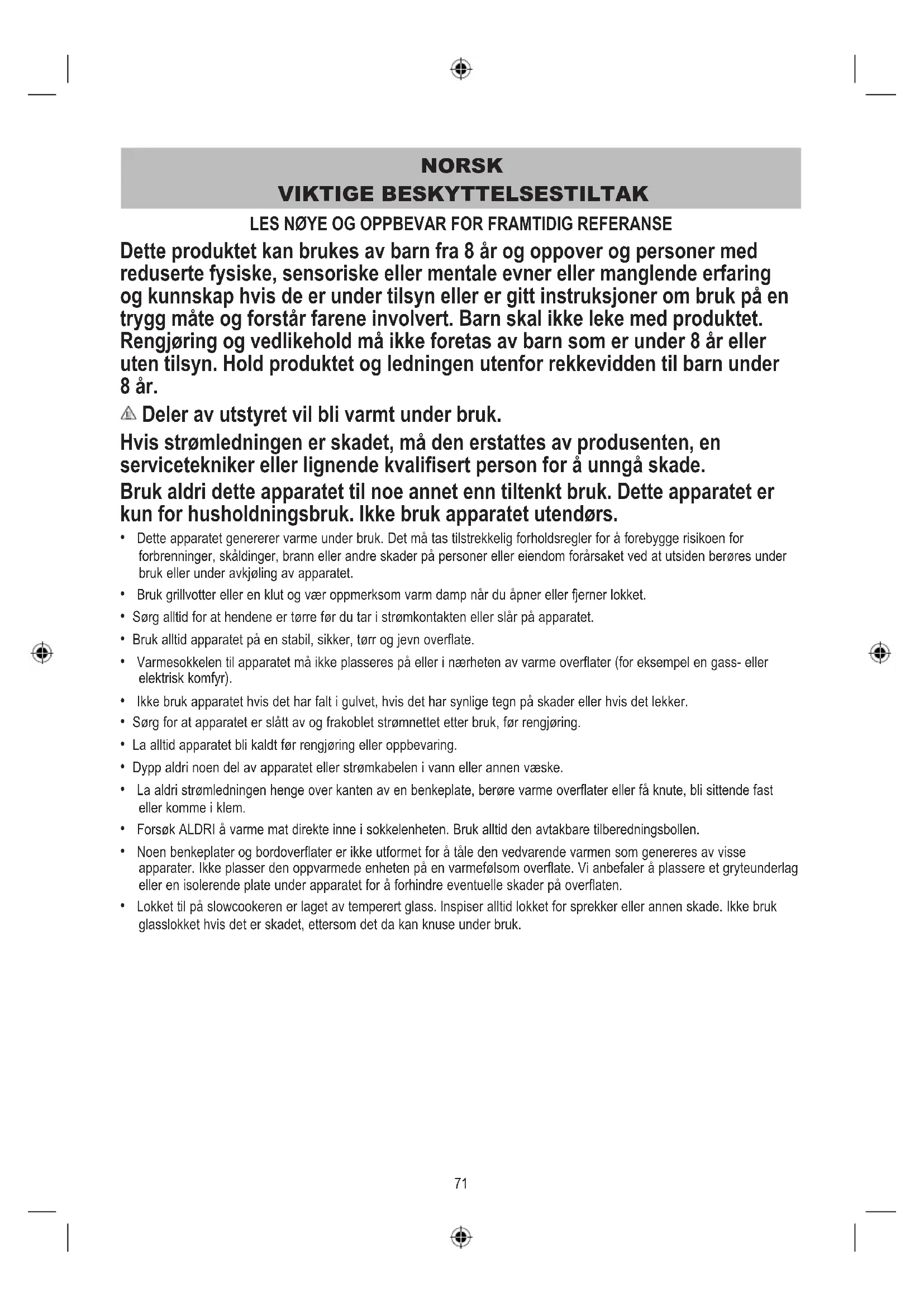 - Dette apparatet genererer varme under bruk. Det må tas tilstrekkelig forholdsregler for å forebygge risikoen for forbrenninger, skåldinger, brann eller andre skader på personer eller eiendom forårsaket ved at utsiden berøres under bruk eller under avkjøling av apparatet.