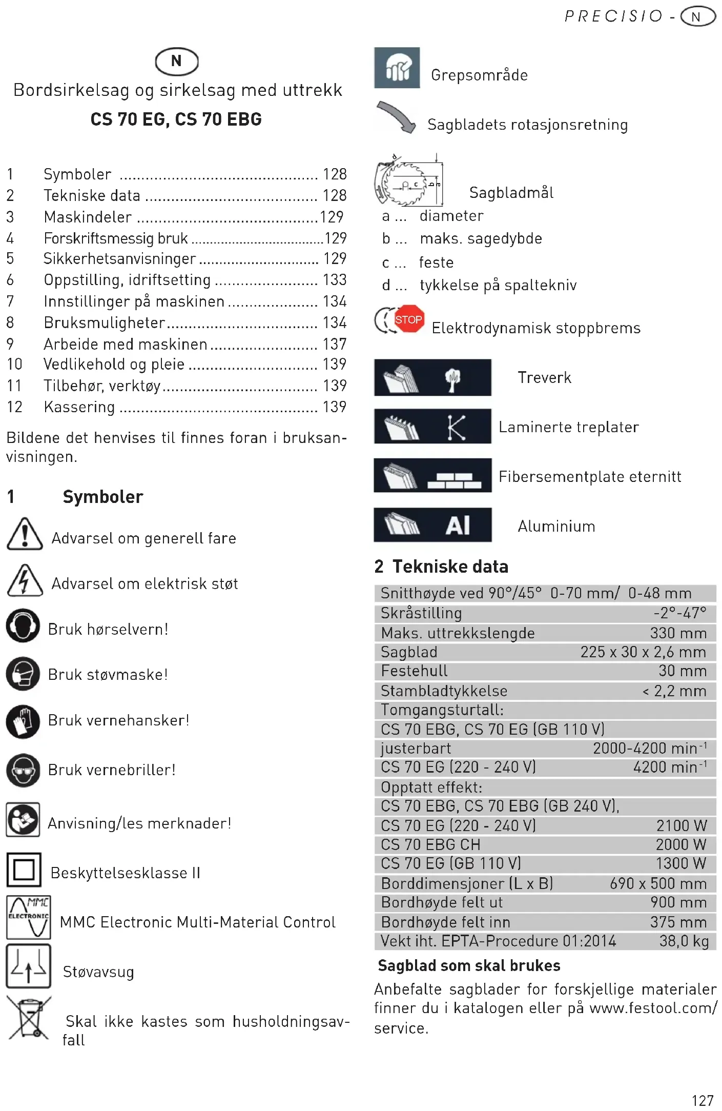 CS 70 EG (GB 110 V) 1300 W Borddimensjoner (L x B) 690 x 500 mm Bordhøyde felt ut 900 mm Bordhøyde felt inn 375 mm Vekt iht. EPTA-Procedure 01:2014 38,0 kg Sagblad som skal brukes Anbefalte sagblader for forskjellige materialer finner du i katalogen eller på www.festool.com/ service. Bordsirkelsag og sirkelsag med uttrekk