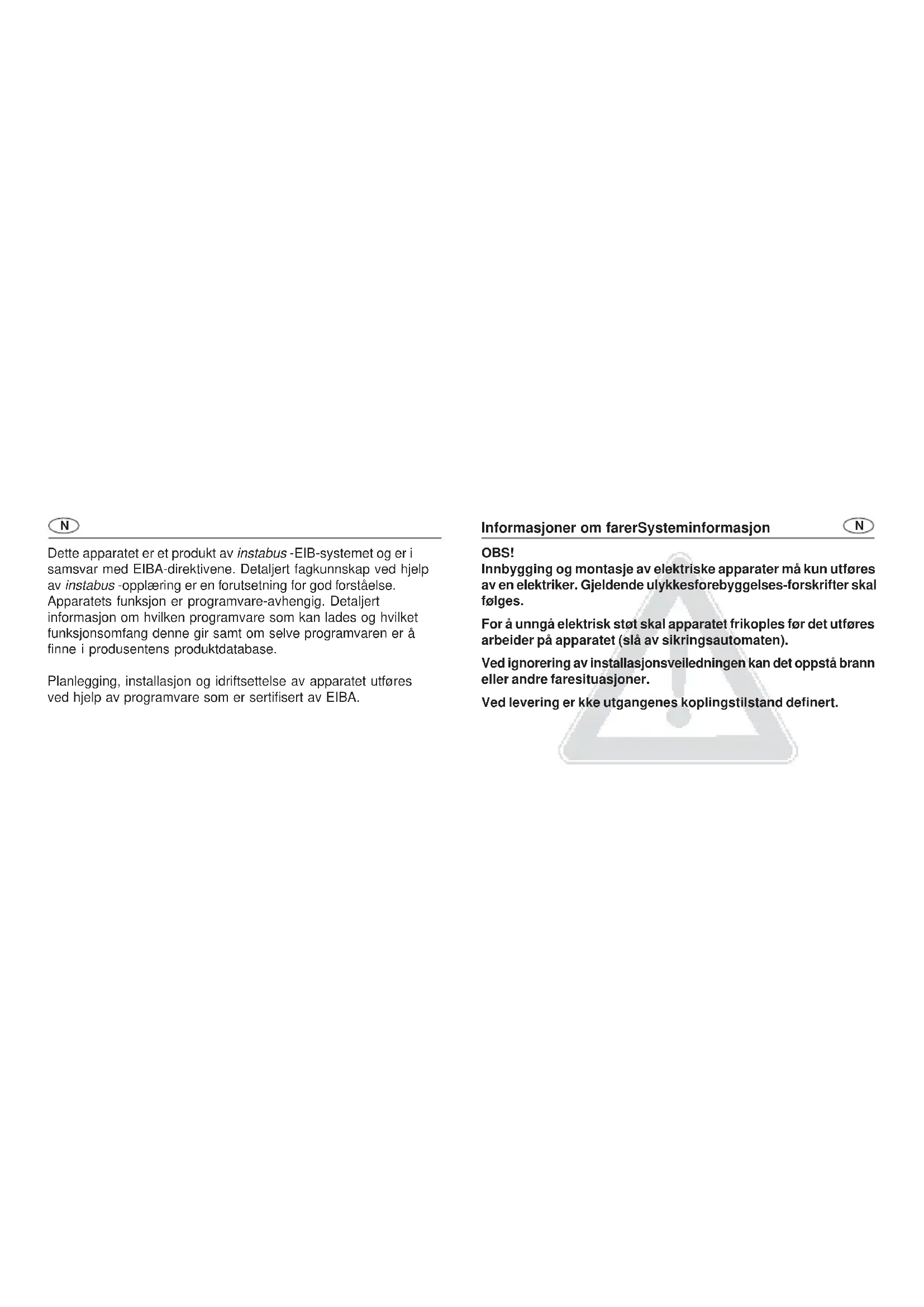 OBS! Innbygging og montasje av elektriske apparater må kun utføres av en elektriker. Gjeldende ulykkesforebyggelses-forskrifter skal følges. For å unngå elektrisk støt skal apparatet frikoples før det utføres arbeider på apparatet (slå av sikringsautomaten). Ved ignorering av installasjonsveiledningen kan det oppstå brann eller andre faresituasjoner. Ved levering er kke utgangenes koplingstilstand definert.Med sine potensialfrie kontakter kopler koplingsaktuatorene 4- dobbelt, 4-dobbelt C-last, 6-dobbelt, 8-dobbelt og 8-dobbelt C-last elektriske forbrukere via instabus EIB. Koplingskommandoer gis ved å aktivere tastesensorer eller binær- innganger i instabus EIB-systemet. Koplingsaktuatorene 4-dobbelt, 4-dobbelt C-last, 8-dobbelt C-last og 8-dobbelt (utganger A1 - A4) er utstyrt med koplingsstillings- indikatorer. Disse brukes også til manuell aktivering av reléene uavhengig av instabus EIB. Koplingskontaktene til C-last-koplingsaktuatoren er dimensjonert spesielt for belastninger av kapasitiv karakter og dermed for høye innkoplingsstrømmer (se tekniske data). Apparatene krever ingen ekstra strømforsyning. MerknaderFunksjon