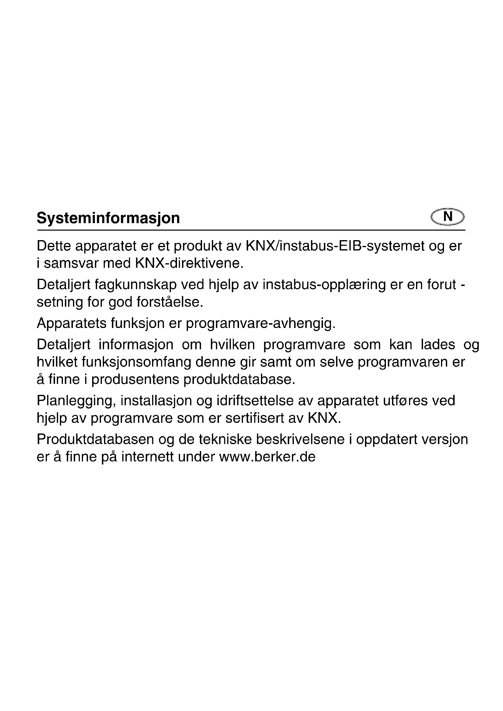 setning for god forståelse. Apparatets funksjon er programvare-avhengig. Detaljert informasjon om hvilken programvare som kan lades og hvilket funksjonsomfang denne gir samt om selve programvaren er å finne i produsentens produktdatabase. Planlegging, installasjon og idriftsettelse av apparatet utføres ved hjelp av programvare som er sertifisert av KNX. Produktdatabasen og de tekniske beskrivelsene i oppdatert versjon er å finne på internett under www.berker.deInformasjoner om farer