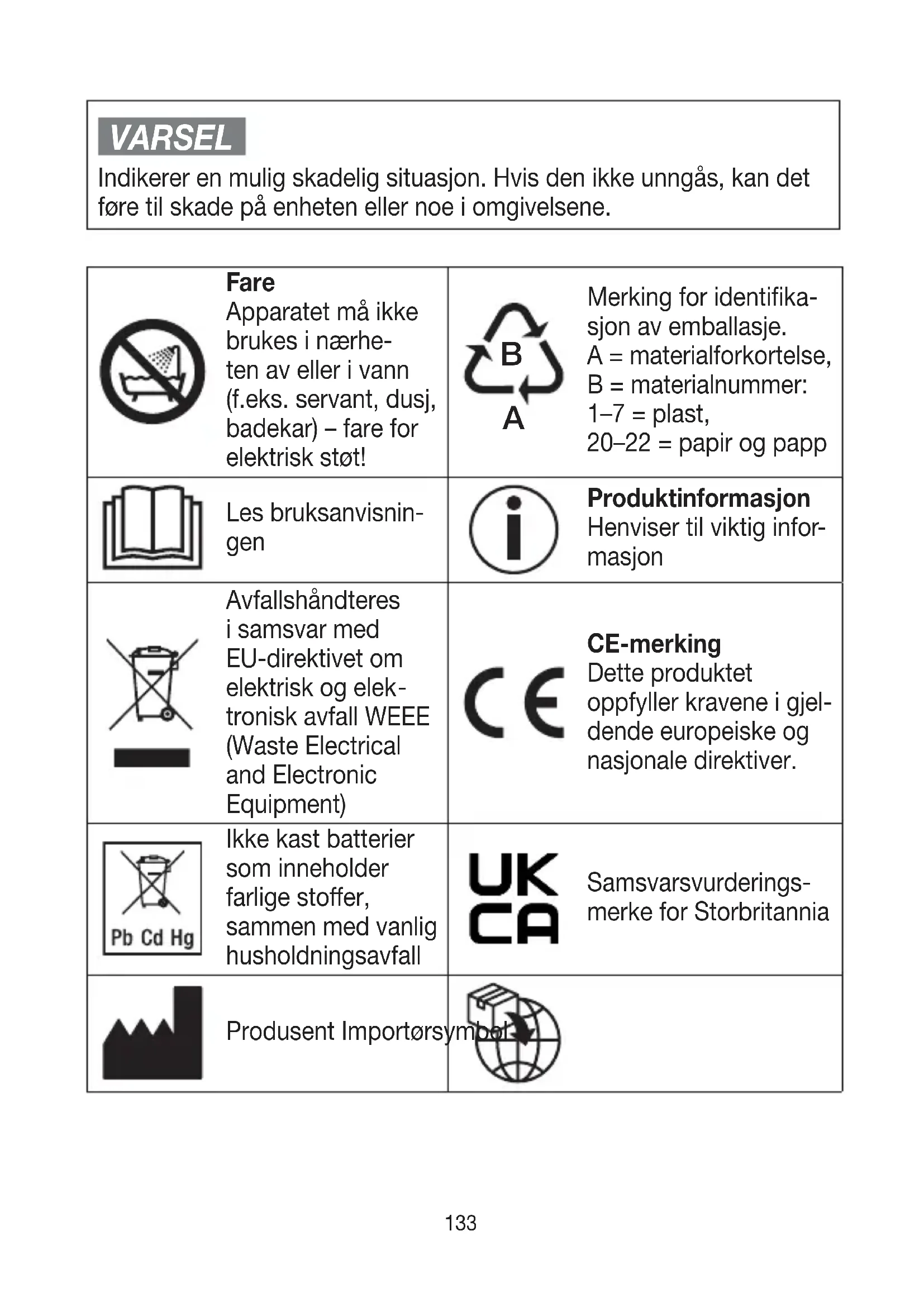 Merking for identifika- sjon av emballasje. A = materialforkortelse, B = materialnummer: 1–7 = plast, 20–22 = papir og papp Les bruksanvisnin- gen Produktinformasjon Henviser til viktig infor