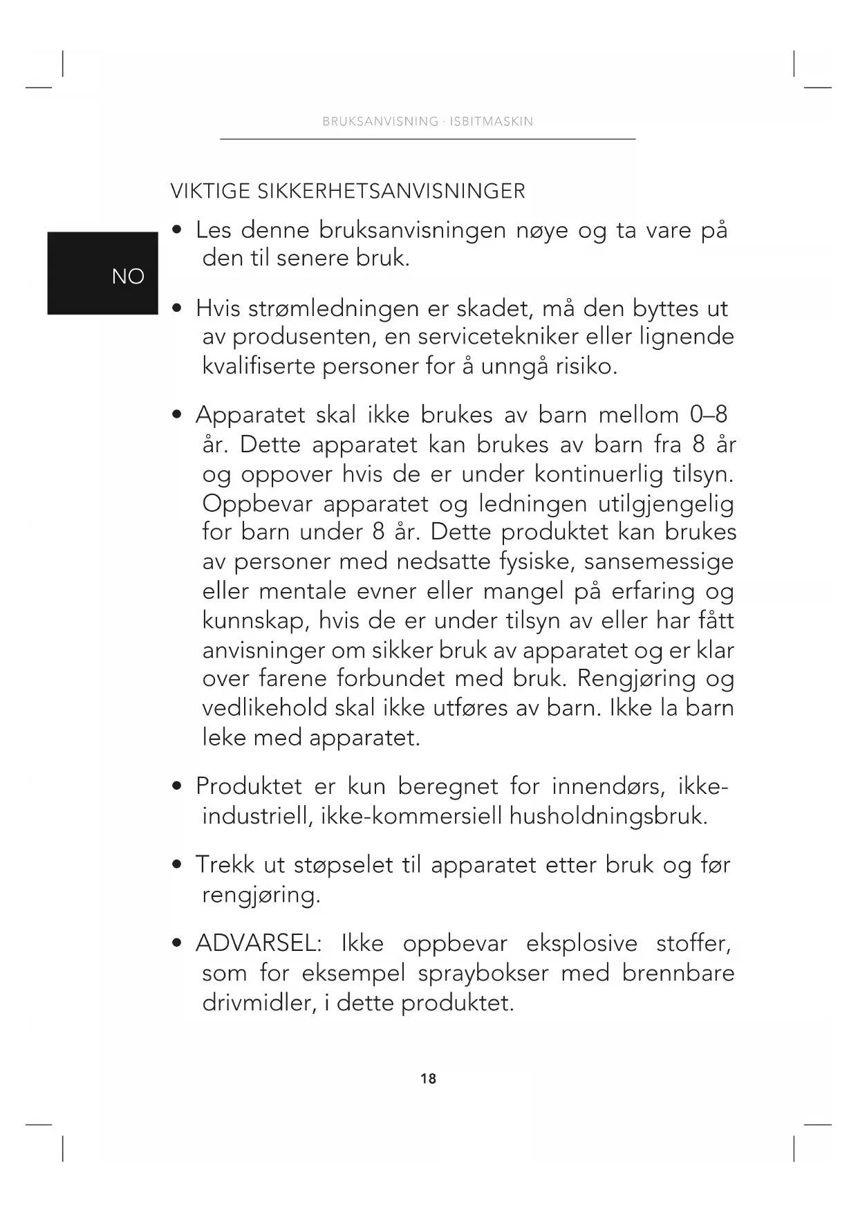 BRUKSANVISNING · ISBITMASKIN GARANTI Wilfa gir 5 års garanti på dette produktet fra kjøpsdatoen. Garantien dekker produksjonsfeil eller defekter som oppstår i garantiperioden. Kjøpskvitteringen fungerer som bevis overfor forhandleren ved eventuelle garantikrav. Garantien gjelder kun for produkter som er kjøpt og brukt i privathusholdning. Garantien ugyldiggjøres hvis produktet brukes kommersielt. Garantien er ikke gyldig hvis produktet misbrukes, ved uaktsom bruk eller hvis du ikke følger instruksjonene fra Wilfa, eller ved uautoriserte modiseringer og reparasjoner. Garantien dekker heller ikke normal bruksslitasje på produktet, misbruk, mangel på vedlikehold, bruk av feil elektrisk spenning eller:
