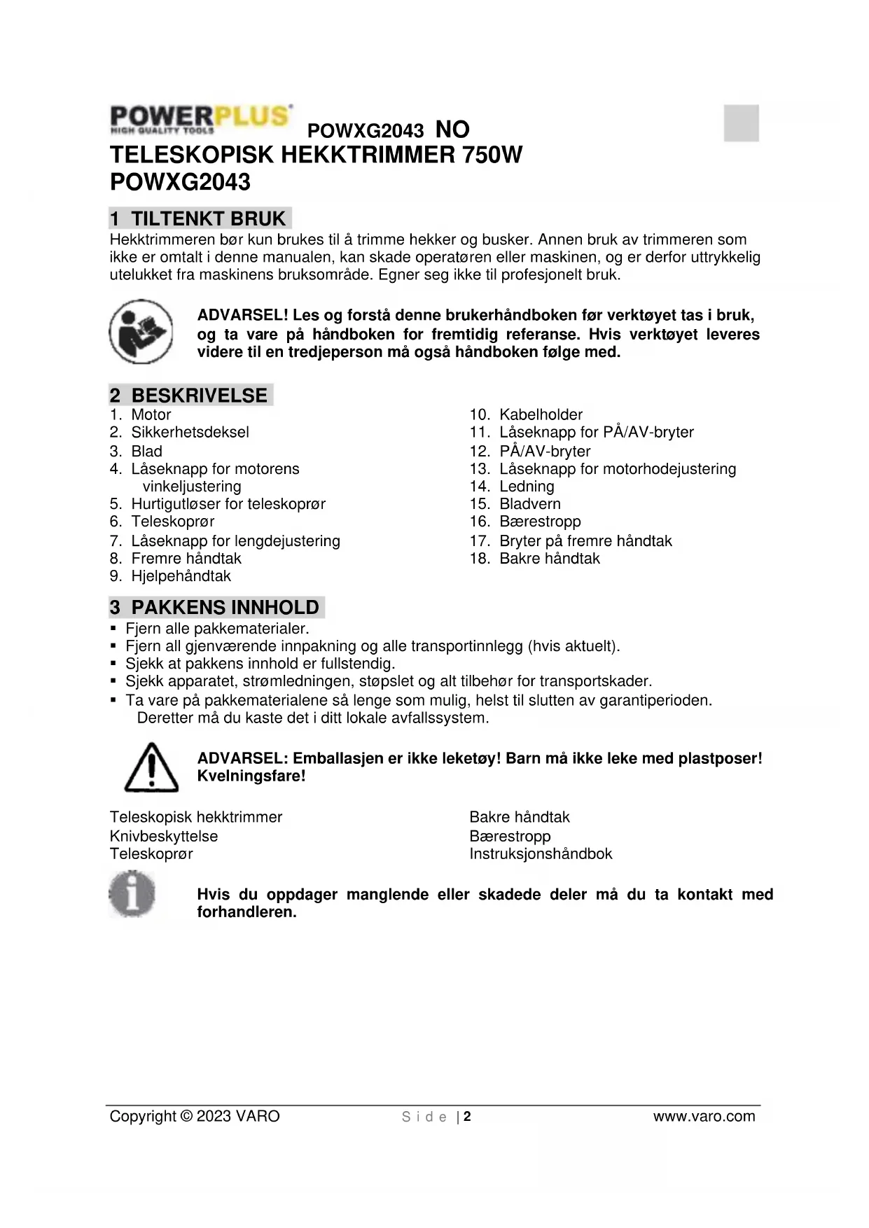 - Bruk aldri hekktrimmeren uten å sjekke tykkelsen på grenene.POWXG2043 NO Copyright © 2023 VARO S i d e | 7 www.varo.com