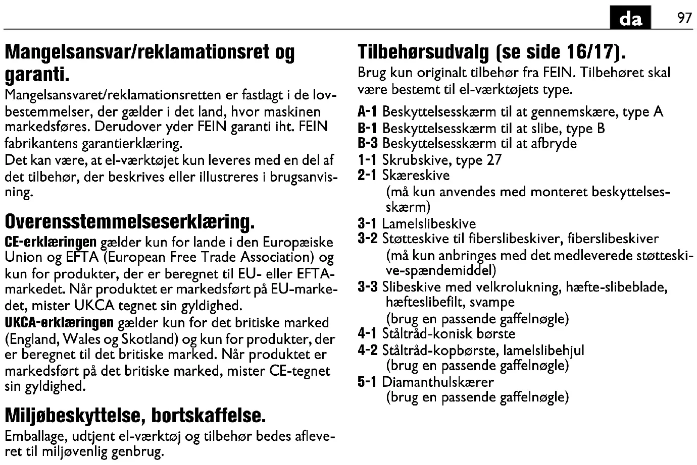 Kun ved CG15-125BLP (**), CG15-150BLP (**), CG15-125BLP Inox (**): Dødmannsbryteren er en ikke låsbar bryter. Dødmanns- bryteren må betjenes kontinuerlig for å holde elektro- verktøyet i drift. Betydning av LED-indikatoren. Hvis det oppstår feil som ikke er oppført i den følgende tabellen, ta kontakt med kundeservicen. Fallsikring For arbeider i høyden kan en egnet fallsikring for pro- duktet plasseres på et beregnet festepunkt. Arbeider i høyden må bare gjennomføres av opplært personell med kunnskaper om verktøysikkerhet og bruk av verktøy i høyden. Bruk kun fallsikringer som oppfyl- ler kriteriene nedenfor. Ellers kan det komme til alvorlige skader eller slike med døden til følge – Bruk kun fallsikringer som oppfyller det aktuelt gyl- dige kravet iht. ANSI/ISEA 121 og ikke overskrider en strukket beltelengde på maksimal 1,2 m. – Pass på at elektroverktøyets totalvekt inklusive montert tilbehør ikke overskrider fallsikringens maksimallast. Vær oppmerksom på sikkerhetsinformasjon og anvis- ninger som er vedlagt fallsikringen. Kontroller fallsikringen før hver bruk for skader som f.eks. vev som er skåret hull på eller som er trevlet og skadet søm. Skadde fallsikringer må ikke brukes og må straks erstattes. Kontroller før hver bruk festepunktet på elektroverktøy- et for at det sitter fast og for skader som sprekk og skarpe kanter. Løse eller skadde festepunkter må ikke benyttes for å feste fallsikringer. Ikke bruk fallsikringen for din egen sikring og fest den ikke på deg selv. Ikke forsøk å fange opp et elektroverktøy som faller ned. Ikke bruk fallsikringen i nærheten av deler som beveger seg. Fallsikringen kunne bli sittende fast og forårsake store farer. Kontroller før bruk av fallsikringen at de løsbare delene på elektroverktøyet sitter fast. Forviss deg om at bruken av en fallsikring ikke svekker bruken av elektroverktøyet og dets beskyttelsesinnret- ninger. Kople fallsikringen kun til elektroverktøyets festepunkt på måten som er fremstilt her (se side 6). Vedlikehold og kundeservice. Vær oppmerksom på at elektroverktøy prinsipielt bare må repareres, vedlikeholdes og kontrolleres av elektrofagfolk, da det ved usakkyndig vedlikehold kunne oppstå alvorlige farer for brukeren. Ved ekstreme bruksvilkår kan det ved bear- beidelse av metall, støv med elektrisk lede- evne sette seg inn i elektroverktøyet. Den doble isoleringen av elektroverktøyet kan svekkes. Blås ofte elektroverktøyets innerom ut gjennom ventila- sjonsspaltene med tørr og oljefri trykkluft. Ved bearbeiding av materialer som inneholder gips kan støv avleires i elektroverktøyets indre og på koblingse- lementet og herde i forbindelse med luftfuktighet. Det kan medføre innskrenkninger på koblingsmekanismen. Blås ofte elektroverktøyets innerom ut gjennom lufte- åpningene og koblingselemenet med tørr og oljefri trykkluft. Produkter som har vært i kontakt med asbest, må ikke sendes til reparasjon. Håndter produkter kontaminert med asbest i henhold til de gyldige nasjonale bestem- melsene for asbestholdig avfall. Ta ved FEIN elektroverktøy og tilbehør som skal repa- reres kontakt med FEIN kundeservice. Adressen finner du i internettet på www.fein.com. Skift ut klistremerker og varselhenvisninger på elektro- verktøyet ved aldring og slitasje. Den aktuelle reservedelslisten for dette elektroverk- tøyet finner du på internettet under www.fein.com. Bruk kun originale reservedeler. Følgende deler kan du skifte ut selv etter behov: innsatsverktøy, ekstrahåndtak, spennflenser, verne- hette, håndbeskyttelse Reklamasjonsrett og garanti. Reklamasjonsretten for produktet gjelder jf. de lovmes- sige bestemmelsene i det landet produktet selges i. Ut over dette yter FEIN garanti i henhold til FEIN-produ- sentens garantierklæring. Denne driftsinstruksen kan inneholde beskrivelser og/eller illustrasjoner av tilbehør som ikke inngår i din leveranse. Samsvarserklæring. CE-erklæringen gjelder kun for land i Den europeiske unionen og i EFTA [EØS] (European Free Trade Asso- ciation) og kun for produkter som er bestemt for mar- kedet i EU eller EFTA. Etter at produktet er introdusert på EU-markedet, mister UKCA-merket sin gyldighet. UKCA-erklæringen gjelder kun for det britiske markedet (England, Wales og Skottland) og kun for produkter som er bestemt for det britiske markedet. Etter at pro- duktet er introdusert på det britiske markedet, mister CE-merket sin gyldighet. Grønn LED Tilstand Forklaring På Driftsklar Normal tilstand så snart støpsel på strømnettet, også under bruk. Blinking Termisk overbelast- ning Advarsel mot og signalise- ring fra en termisk utkop- ling ved overbelastning. I tillegg varsles brukeren ved et sterkere fall i turtallet (effektbegrensning). Av Feil Hvis den grønne LED er av, finnes en feil, f.eks. defekt nettkabel.105