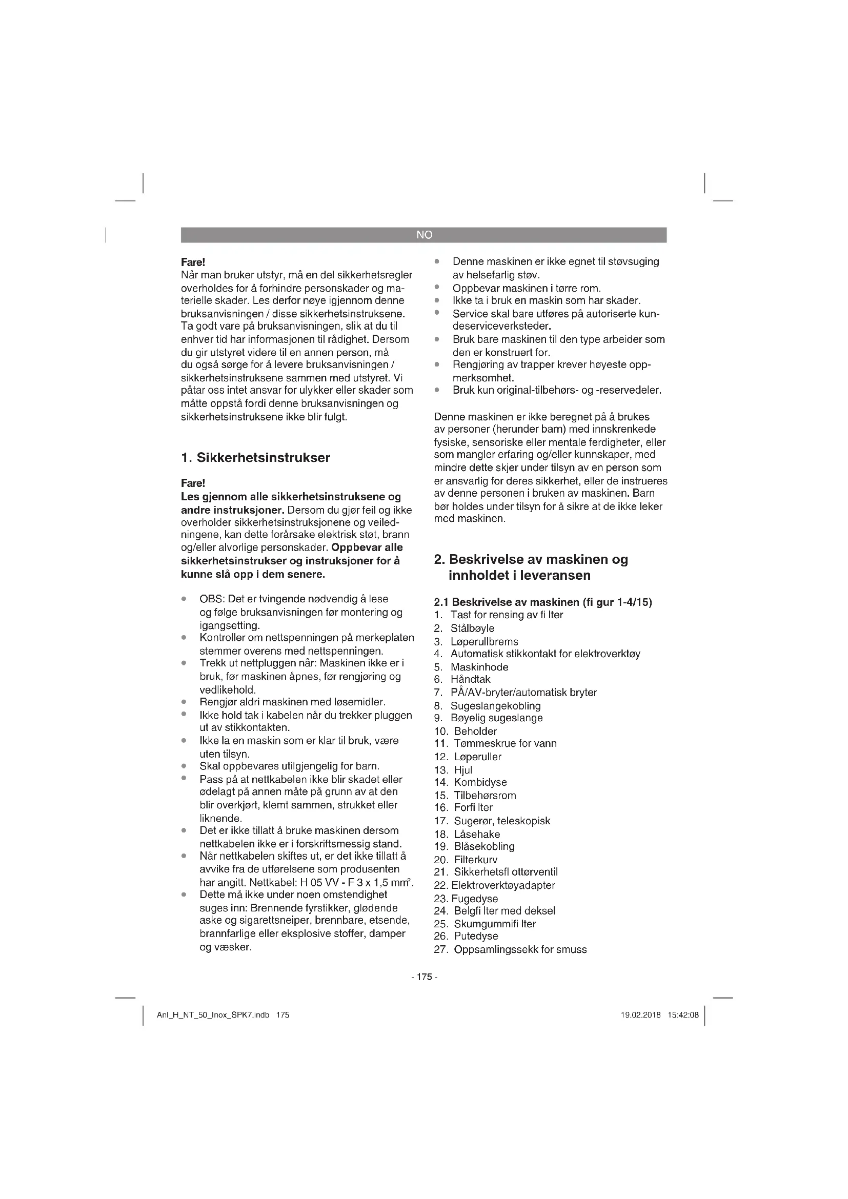 Maskinen er utstyrt med et rensesystem for fi lter. Dette gjør det mulig å suge opp store mengder fi nt støv uten at oppsamlingssekken for støv er montert. Merk! Rensesystemet for fi lter må kun aktiveres når forfi lteret er montert! Merk! Rensesystemet for fi lter kan bare aktiveres når maskinen er i gang. Når sugeeff ekten avtar, kan rensingen av fi lteret aktiveres med knappetrykk. Da renses det tils- mussede forfi lteret, og sugeeff ekten økes igjen. Betjen rensetasten (1) 6 ganger med enden av sugeslangen mens maskinen er i gang. Hold tasten innetrykket i 4 sekunder hver gang den betjenes. Pass på at det da ikke oppstår knekk på sugeslangen. Anl_H_NT_50_Inox_SPK7.indb 178Anl_H_NT_50_Inox_SPK7.indb 178 19.02.2018 15:42:0819.02.2018 15:42:08NO