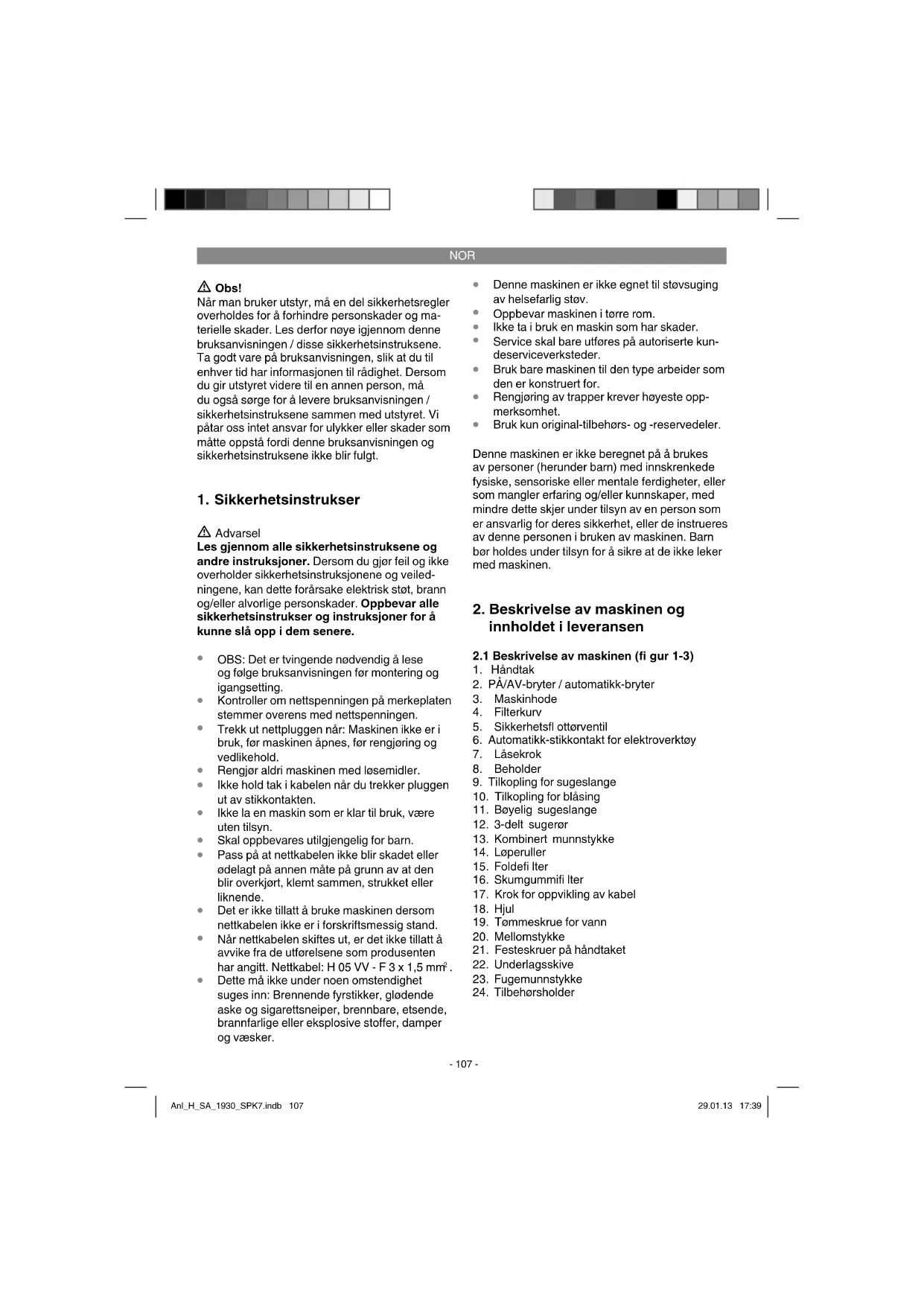 Våt- / tørrsugeren er egnet til våt og tørr støv- suging når tilsvarende fi lter benyttes. Maskinen er ikke beregnet på støvsuging av brennbare, eksplosive eller helseskadelige stoff er. Maskinen skal kun brukes til arbeider den er be- regnet på. All annen bruk som går ut over dette blir regnet for å være ikke-forskriftsmessig. Pro- dusenten påtar seg intet ansvar for noen form for materielle skader eller personskader som måtte resultere av slik bruk. For slike skader er ene og alene brukeren/maskinpasseren ansvarlig. Vær oppmerksom på at våre maskiner ikke er konstruert for bruk innen næringsliv, håndverk el- ler industriell bruk. Slik bruk er ikke forskriftsmes- sig. Vi gir ingen garanti dersom maskinen brukes i næringslivet, håndverks- eller industribedrifter, eller blir brukt til arbeider som kan likestilles med en slik bruk.