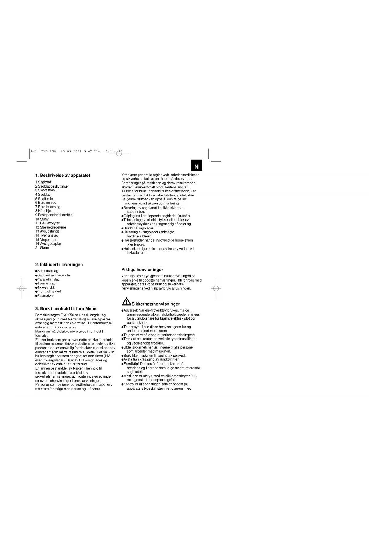 Bordsirkelsagen TKS 250 brukes til lengde- og skråsaging (kun med tverranslag) av alle typer tre, avhengig av maskinens størrelse. Rundtømmer av enhver art må ikke skjæres. Maskinen må utelukkende brukes i henhold til formålet. Enhver bruk som går ut over dette er ikke i henhold til bestemmelsene. Brukeren/betjeneren selv, og ikke produsenten, er ansvarlig for defekter eller skader av enhver art som måtte resultere av dette. Det må kun brukes sagblader som er egnet for maskinen (HM- eller CV-sagblader). Bruk av HSS-sagblader og deleskiver av enhver art er forbudt. En annen bestanddel av bruken i henhold til formålene er oppfølgingen både av sikkerhetshenvisninger, av monteringsveiledningen og av driftshenvisninger i bruksanvisningen. Personer som betjener og vedlikeholder maskinen, må være fortrolige med denne og må være Ytterligere generelle regler vedr. arbeidsmedisinske og sikkerhetstekniske områder må observeres. Forandringer på maskinen og derav resulterende skader utelukker totalt produsentens ansvar. Til tross for bruk i henhold til bestemmelsene, kan bestemte risikofaktorer ikke fullstendig utelukkes. Følgende risikoer kan oppstå som følge av maskinens konstruksjon og montering: Berøring av sagbladet i et ikke skjermet sagområde. Griping inn i det løpende sagbladet (kuttsår). Tilbakeslag av arbeidsstykker eller deler av arbeidsstykker ved ufagmessig håndtering. Brudd på sagblader. Utkasting av sagbladers ødelagte hardmetalldeler. Hørselskader når det nødvendige hørselsvern ikke brukes. Helseskadelige emisjoner av trestøv ved bruk i lukkede rom. Viktige henvisninger Vennligst les nøye gjennom bruksanvisningen og legg merke til oppgitte henvisninger. Bli fortrolig med apparatet, dets riktige bruk og sikkerhets- henvisningene ved hjelp av bruksanvisningen. Sikkerhetshenvisninger Advarsel: Når elektroverktøy brukes, må de grunnleggende sikkerhetsforholdsreglene følges for å utelukke fare for brann, elektrisk støt og personskader. Ta hensyn til alle disse henvisningene før og under arbeidet med sagen Ta godt vare på disse sikkerhetshenvisningene. Trekk ut nettkontakten ved alle typer innstillings- og vedlikeholdsarbeider. Utdel sikkerhetshenvisningene til alle personer som arbeider med maskinen. Bruk ikke maskinen til saging av peisved. Avstå fra skråsaging av rundtømmer. Forsiktig! Det består fare for skader på hendene og fingrene som følge av det roterende sagbladet. Maskinen er utstyrt med en sikkerhetsbryter (11) mot gjenstart etter spenningsfall. Kontrollér at spenningen som er oppgitt på apparatets typeskilt stemmer overens med Anl. TKS 250 03.05.2002 9:47 Uhr Seite 63N Dersom en forlengringskabel er nødvendig, sørg for at dennes diameter er tilstrekkelig for sagens strømopptak. Minste diameter er 1 mm