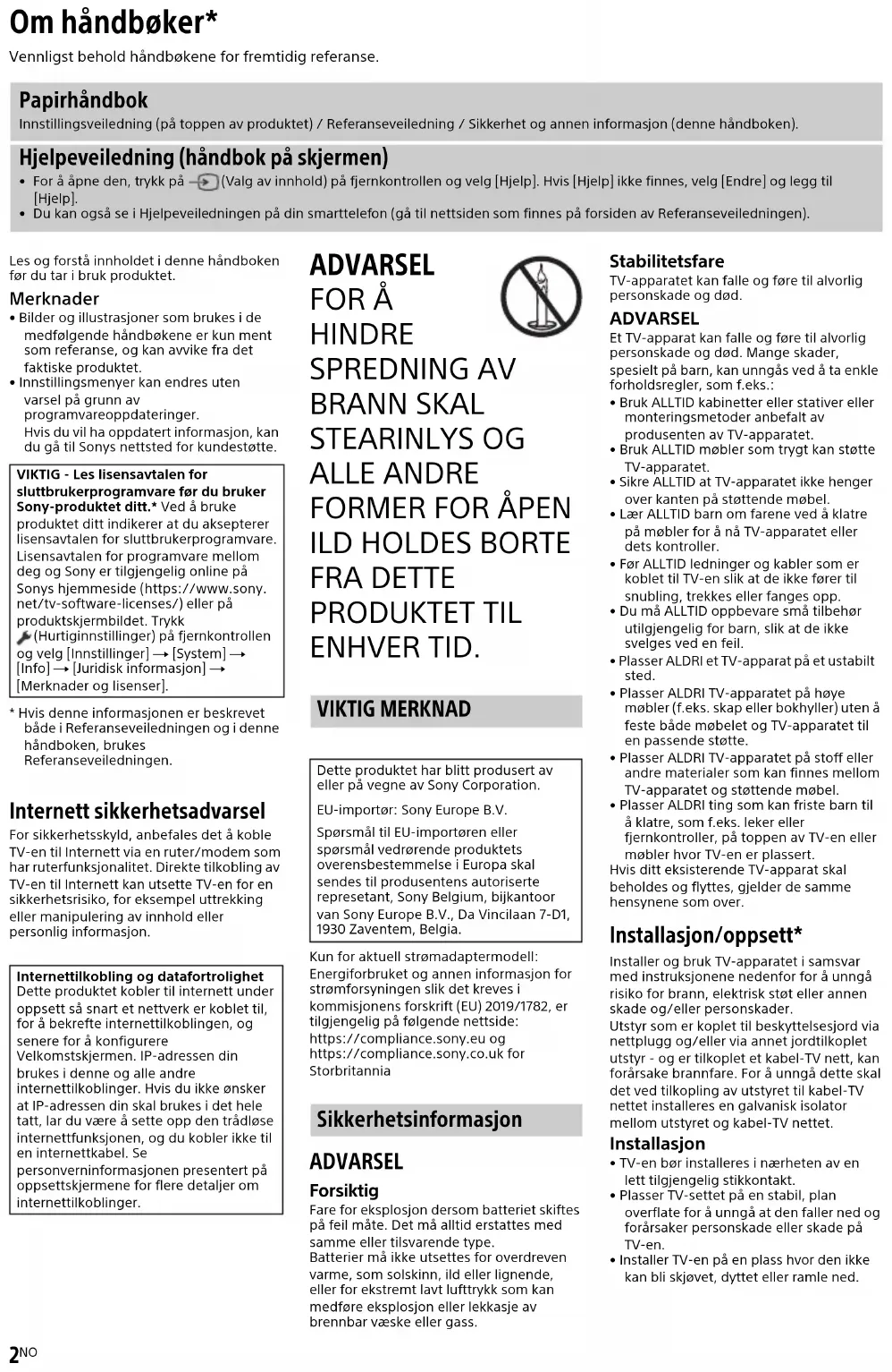 - Bilder og illustrasjoner som brukes i de medfølgende håndbøkene er kun ment som referanse, og kan avvike fra det faktiske produktet.• Innstillingsmenyer kan endres uten varsel på grunn av programvareoppdateringer.Hvis du vil ha oppdatert informasjon, kan du gå til Sonys nettsted for kundestøtte.* Hvis denne informasjonen er beskrevet både i Referanseveiledningen og i denne håndboken, brukes Referanseveiledningen. Internett sikkerhetsadvarsel For sikkerhetsskyld, anbefales det å koble TV-en til Internett via en ruter/modem som har ruterfunksjonalitet. Direkte tilkobling av TV-en til Internett kan utsette TV-en for en sikkerhetsrisiko, for eksempel uttrekking eller manipulering av innhold eller personlig informasjon. ADVARSEL FOR Å HINDRE SPREDNING AV BRANN SKAL STEARINLYS OG ALLE ANDRE