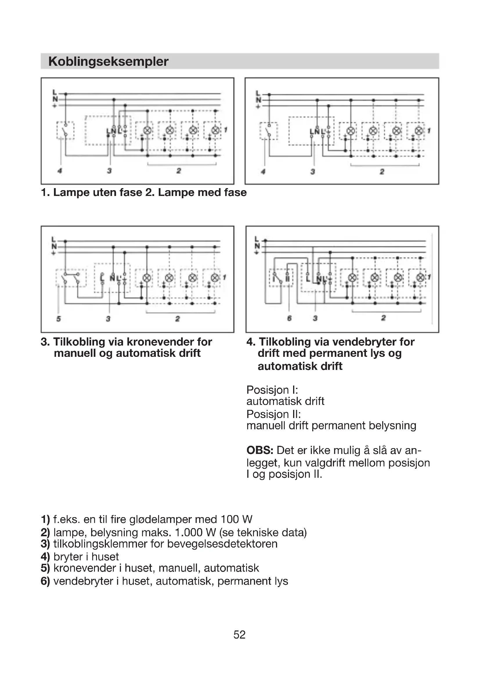 Koblingseksempler53 Når bevegelsesmelderen er koblet til og festet til veggholderen, kan an- legget slås på. Etter at ringdekslet er tatt av, byr apparatet på to innkoblingsmuligheter. Utløsningstid (Tidsinnstilling) (Fabrikkinnstilling: 10 s) Trinnløst justerbar belysningstid fra ca. 10 s – maks. 15 min Stillskruen stilt på (1) = korteste tid (10 s) Stillskruen stilt på (6) = lengste tid (15 min) Når bevegelsessensoren skal innstilles for dekningsområdet, anbefales det å stille inn kortest mulig tid. Funksjon Skumringsinnstilling (Fabrikkinnstilling: 2.000 lx) Sensoren har et trinnløst justerbart reaksjonsnivå fra 2 – 2.000 lx Stillskruen på (1) = dagslysdrift ca. 2.000 lx Stillskruen på (6) = skumringsdrift ca. 2 lx Når bevegelsessensoren skal innstilles for dekningsområdet og for funksjonstest i dagslys, må innstillingsskruen være vridd helt til venstre. 2 – 2.000 lx ca. 10 s – maks. 15 min54 Tekniske data Mål (H x B x D): 84 x 89 x 90 mm Monteringshøyde: 1,8 ... 4 m Effekt: Lyspære-/halogenlampelast 1000 W Lysrør elektronisk ballast 1000 W Lysrør ukompensert 500 W Lysrør parallellkompensert 500 W Lavvolt halogenpærer 1000 VA