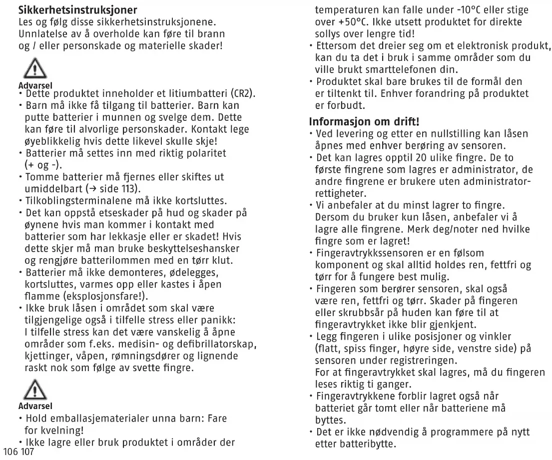 = 10x grøn: Fingeren lagres med 10 avtrykk. Registrer ellers ere LED Obs! Ikke lager administrator-ngeravtrykkene mer enn én gang, ellers blir de ikke lenger gjenkjent som administrator. Da kan ikke ngeravtrykk lagres eller slettes lenger.112 113 Slett alle lagrede fingeravtrykk (Fabrikkinnstilt) Kun administratoren (de to første ngrene) kan slette lagrede ngeravtrykk Lite batteri Dersom låsen avgir en «SOS»-advarsel etter å ha blitt åpnet (3 korte toner, 3 lange toner, 3 korte toner“), må du skie ut batteriet (→ side 3). Etter noen advarsler er det ikke lenger mulig å lukke låsen før batteriet er skiet ut, for å hindre at man skulle låses ute. Bruk bare høykvalitetsbatterier, f.eks. Varta eller Panasonic. Tekniske data Oppløsning 508DPI Falskavvisningsrate ca. 5 % (FRR) Falskakseptansrate <0,002% (FAR) Registreringstid <200 ms Dristemperaturområde -10°C til +50°C Batteritype 1x CR2 (850 mAh)
