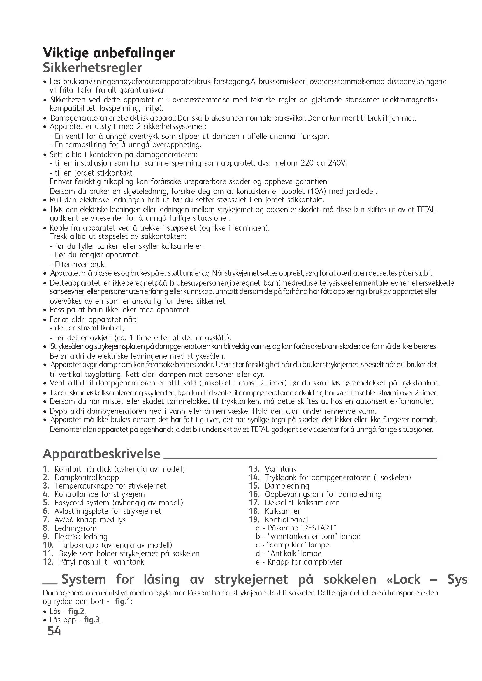a - På-knapp “RESTART” b - “vanntanken er tom” lampe c - “damp klar” lampe d - “Antikalk”-lampe e - Knapp for dampbryter Apparatbeskrivelse System for låsing av strykejernet på sokkelen «Lock – System» Dampgeneratorener utstyrtmeden bøyle medlåssomholder strykejernetfast til sokkelen.Dettegjør detlettereå transportere den og rydde den bort - fig.1: