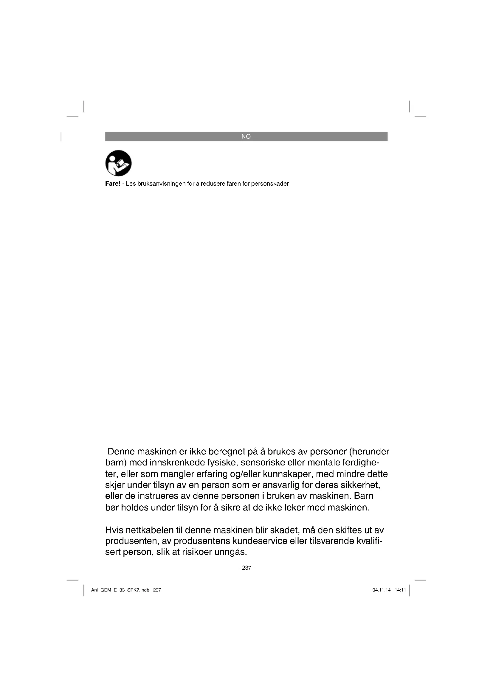 Fare! - Les bruksanvisningen for å redusere faren for personskader Denne maskinen er ikke beregnet på å brukes av personer (herunder barn) med innskrenkede fysiske, sensoriske eller mentale ferdighe- ter, eller som mangler erfaring og/eller kunnskaper, med mindre dette skjer under tilsyn av en person som er ansvarlig for deres sikkerhet, eller de instrueres av denne personen i bruken av maskinen. Barn bør holdes under tilsyn for å sikre at de ikke leker med maskinen. Hvis nettkabelen til denne maskinen blir skadet, må den skiftes ut av produsenten, av produsentens kundeservice eller tilsvarende kvalifi - sert person, slik at risikoer unngås. Anl_GEM_E_33_SPK7.indb 237Anl_GEM_E_33_SPK7.indb 237 04.11.14 14:1104.11.14 14:11NO