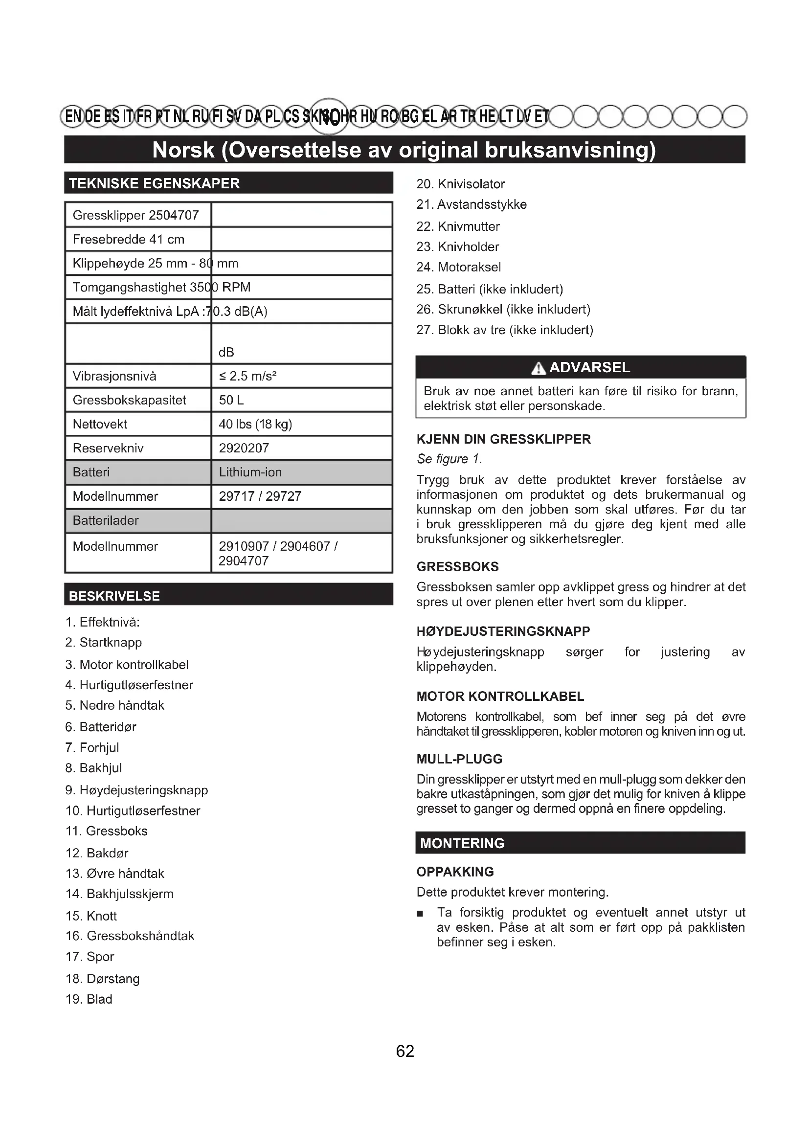 ydejusteringsknapp sørger for justering av klippehøyden.MOTOR KONTROLLKABELMotorens kontrollkabel, som bef inner seg på det øvre håndtaket til gressklipperen, kobler motoren og kniven inn og ut.MULL-PLUGGDin gressklipper er utstyrt med en mull-plugg som dekker den bakre utkaståpningen, som gjør det mulig for kniven å klippe gresset to ganger og dermed oppnå en nere oppdeling.MONTERINGOPPAKKINGDette produktet krever montering. ■ Ta forsiktig produktet og eventuelt annet utstyr ut av esken. Påse at alt som er ført opp på pakklisten befinner seg i esken. 62NO EN DE ES IT FR PT NL RU FI SV DA PL CS SK SL HR HU RO BG EL AR TR HE LT LV ET Norsk (Oversettelse av original bruksanvisning) ADVARSEL Ikke bruk produktet dersom noen del på Pakklisten allerede er montert når du pakker opp produktet. Deler på denne listen er ikke montert på produktet ved fabrikk og krever montering av kunden. Bruk av et produkt som ikke er korrekt montert kan føre til alvorlig personskade. ■ Inspiser innholdet grundig og påse at det ikke har oppstått skader under transporten. ■ Ikke kast emballasjen før det er foretatt en grundig inspeksjon og gjennomført en tilfredsstillende prøve av produktet. ■ Hvis noen del er skadet eller mangler, vennligst kontakt Greenworks tools Kundeservice for hjelp.PAKKELISTE ■ Gressklipper ■ Batterinøkkel ■ Gressboks ■ Mull-plugg ■ Brukermanual ADVARSEL Om noen deler er skadet eller mangler ikke bruk dette produktet før det er reparert eller erstattet. Bruk av dette produktet med skadede eller manglende deler kan føre til alvorlig personskade. ADVARSEL Ikke forsøk å modif isere dette produktet eller Alle slike forandringer eller modif ikasjoner er feil. Hvilken som helst forandring eller modif ikasjon eller feilaktig bruk kan resultere i farlige forhold som leder til mulig alvorlig personskade. ADVARSEL Ikke sett inn isolatornøkkelen før monteringen er fullført og du er klar til å starte klipping av gress. Brudd på dette kan resultere i utilsiktet start og alvorlig personskade. ADVARSEL Fjern batteripakken fra klipperen når du skal montere deler for å unngå utilsiktet start med tilhørende alvorlig personskade. ADVARSEL Bruk aldri gressklipperen uten korrekt sikkerhetsutstyr i orden og på plass. Bruk aldri klipperen dersom sikkerhetsenheter er defekte. Dersom produktet brukes med defekte eller manglende deler kan det føre til alvorlige personskader.UTFELLING OG JUSTERING AV NEDRE HÅNDTAKSe gure 2. ■ Trekk opp og tilbake det øvre håndtaket for å heve håndtaket til bruksposisjon. Påse at håndtaket smetter trygt på plass. ■ Stram til det øvre håndtaket med hurtigutløserfestnerne på begge sider. MERK: Påse at begge sidene er satt til samme posisjon for korrekt sammensetting.MONTERING AV ØVRE HÅNDTAK Se gure 3. ■ Tilpass monteringshullene på det øvre håndtaket med hullene på det nedre håndtaket. Stram til det øvre håndtaket med hurtigutløserfestnerne på begge sider. Gjenta operasjonen på den andre siden.INSTALLERING AV GRESSBOKSENSe gure 4. ■ Løft opp bakre tømmedeksel. ■ Løft gressoppsamleren i håndtaket og plasser den under bakre utkastdør slik at krokene på gressoppsamleren hviler på dørstangen. ■ Frigjør den bakre utkastdøren. Når gressoppsamleren er korrekt montert vil krokene på oppsamleren gå gjennom åpningen på den bakre utkastdøren.INSTALLERING AV MULL-PLUGGENSe gur 5. ■ Løft og hold åpen den bakre utkastdøren. ■ Ta tak i mull-pluggens håndtak og sett den inn med en svak vinkel som vist. ■ Skyv mull-pluggen forsvarlig på plass. ■ Senk den bakre utkastdøren.STILLE BLADHØYDENSe gure 6.Ved forsendelse blir hjulene på gressklipperen stilt på en lav klippehøyde. Før du tar i bruk gressklipperen for første dag, bør du justere kuttehøyden slik at den passer dine behov. En gjennomsnittlig plen skal være mellom 38 mm og 51 mm i kjølige måneder og mellom 51 mm og 70 mm 63NO EN DE ES IT FR PT NL RU FI SV DA PL CS SK SL HR HU RO BG EL AR TR HE LT LV ET Norsk (Oversettelse av original bruksanvisning) ■ Løft opp og hold åpent batteridekslet. ■ Tilpass batteriet til gressklipperens batteriport. ■ Påse at låsehakene på begge sider av batteripakken er i inngrep og at batteripakken er sikret i laderen før bruken påbegynnes. ■ Sett inn batterinøkkelen. ■ Hvis maskinen ikke skal brukes umiddelbart må ikke batterinøkkelens settes inn. ■ Steng døren.FOR Å FJERNE BATTERIPAKKENSe gure 7. ■ Stopp motoren og frigjør effektspaken. ■ Åpne batteridøren. ■ Fjern batterinøkkelen. ■ Trykk inn batteriets utløserknapp på gressklipperen. Det vil føre til at batteriet stikker litt utenfor verktøyet ■ Fjern batteripakken fra produktet.STARTE/STANSE KLIPPERENSe gure 8. ■ Åpne batteridøren og sett batteriet på plass. ■ Trykk inn og hold starterknappen. ■ Trykk effektspaken oppover mot håndtaket for å starte gressklipperen og slipp nøkkelen. ■ For å stoppe gressklipperen slippes bryterens kontrollspak.MERK : En høy, skingrende lyd og gnister kan merkes når den elektriske motoren bremses ned. Dette er normalt.GRESSKLIPPINGSRÅD ■ Påse at gressklipperen ikke kommer i kontakt med steiner, pinner, ståltråd eller andre gjenstander som kan skade gressklipperens kniver eller motor. Ikke kjør gressklipperen over eiendomsmarkeringer eller metallstolper. Slike gjenstander kan bli slengt opp fra klipperen i enhver retning og forårsake alvorlige personskader på både operatør og tilskuere. ■ For å sikre god helse i plenen bør alltid 1/3-del eller mindre av gressets totale lengde klippes. ■ Ikke klipp vått gress, det vil feste seg til undersiden av lokket og hindre at gresset samles opp i bagen eller sprutes ut riktig. ■ Nytt eller tykt gress kan kreve større klippehøyde. ■ Undersiden på gressklipperen skal rengjøres etter hvert bruk for å fjerne gresskutt, blader, smuss og annet som har samlet seg. ■ Når du kutter høyt g