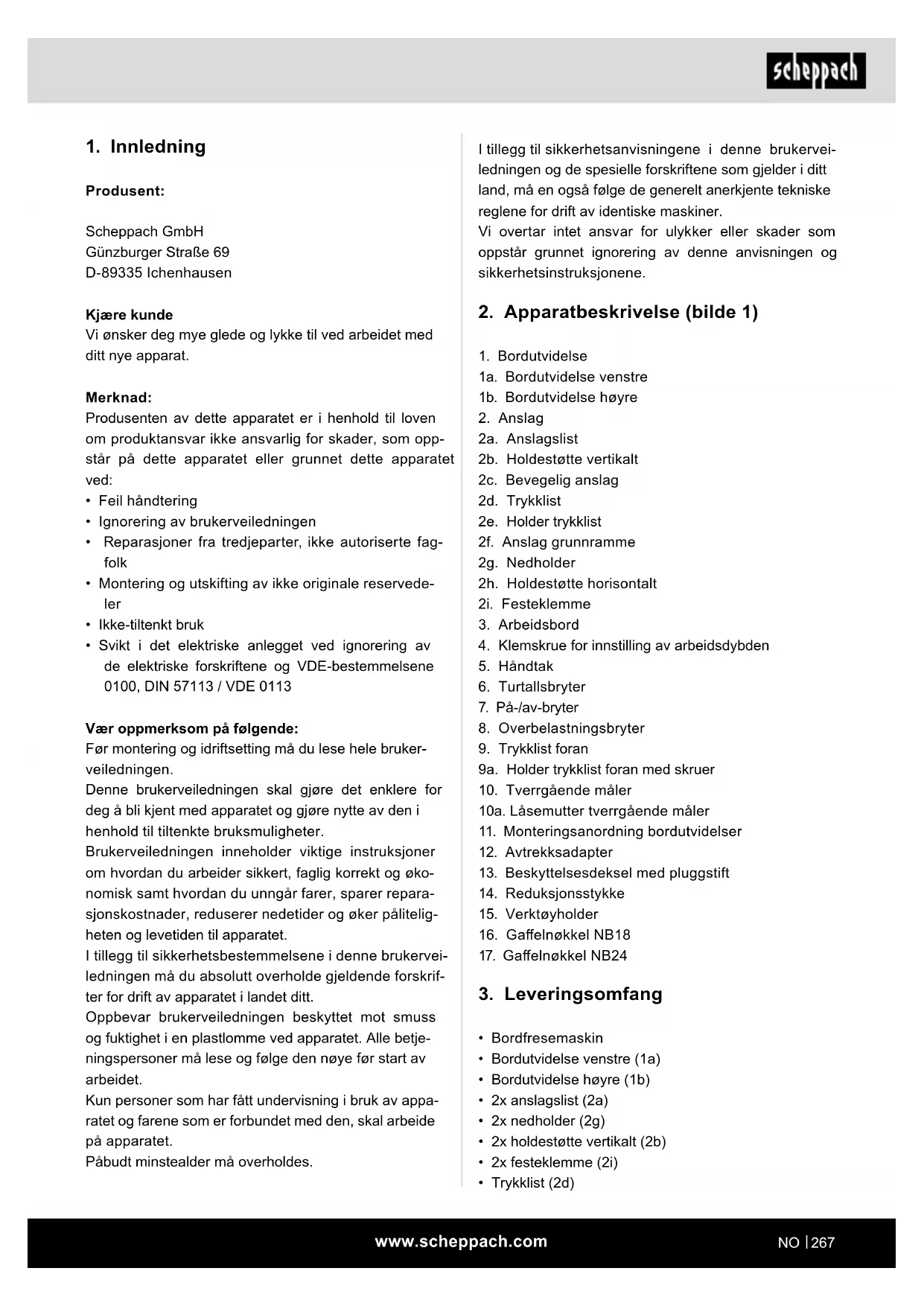 - Svikt i det elektriske anlegget ved ignorering av de elektriske forskriftene og VDE-bestemmelsene 0100, DIN 57113 / VDE 0113 Vær oppmerksom på følgende: Før montering og idriftsetting må du lese hele bruker- veiledningen. Denne brukerveiledningen skal gjøre det enklere for deg å bli kjent med apparatet og gjøre nytte av den i henhold til tiltenkte bruksmuligheter. Brukerveiledningen inneholder viktige instruksjoner om hvordan du arbeider sikkert, faglig korrekt og øko- nomisk samt hvordan du unngår farer, sparer repara- sjonskostnader, reduserer nedetider og øker pålitelig- heten og levetiden til apparatet. I tillegg til sikkerhetsbestemmelsene i denne brukervei- ledningen må du absolutt overholde gjeldende forskrif- ter for drift av apparatet i landet ditt. Oppbevar brukerveiledningen beskyttet mot smuss og fuktighet i en plastlomme ved apparatet. Alle betje- ningspersoner må lese og følge den nøye før start av arbeidet. Kun personer som har fått undervisning i bruk av appa- ratet og farene som er forbundet med den, skal arbeide på apparatet. Påbudt minstealder må overholdes.www.scheppach.com
