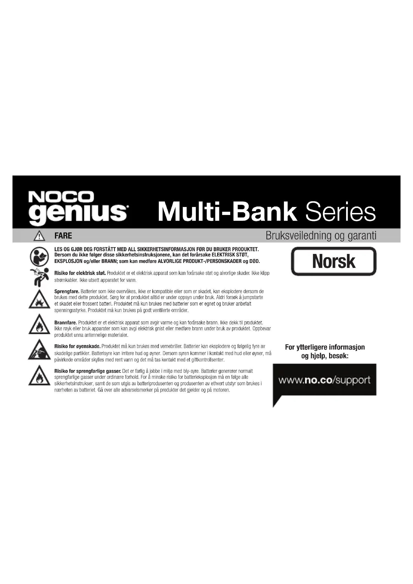 Vi anbefaler at registrere dit NOCO-produkt for at kunne uploade kvittering og udvide dine gældende garantidatoer. Du kan registrere dit NOCO-produkt online på: no.co/ register. Hvis du har spørgsmål vedrørende din garanti eller dit produkt, så kontakt NOCO Support (e-mail og telefonnummer ovenfor) eller skriv til: The NOCO Company, 30339 Diamond Parkway, #102, Glenwillow, OH 44139 USA. DABruksveiledning og garanti FARE LES OG GJØR DEG FORSTÅTT MED ALL SIKKERHETSINFORMASJON FØR DU BRUKER PRODUKTET. Dersom du ikke følger disse sikkerhetsinstruksjonene, kan det forårsake ELEKTRISK STØT, EKSPLOSJON og/eller BRANN; som kan medføre ALVORLIGE PRODUKT-/PERSONSKADER og DØD. Risiko for elektrisk støt. Produktet er et elektrisk apparat som kan forårsake støt og alvorlige skader. Ikke klipp strømkabler. Ikke utsett apparatet for vann. Sprengfare. Batterier som ikke overvåkes, ikke er kompatible eller som er skadet, kan eksplodere dersom de brukes med dette produktet. Sørg for at produktet alltid er under oppsyn under bruk. Aldri forsøk å jumpstarte et skadet eller frossent batteri. Produktet må kun brukes med batterier som er egnet og bruker anbefalt spenningsstyrke. Produktet må kun brukes på godt ventilerte områder. Brannfare. Produktet er et elektrisk apparat som avgir varme og kan forårsake brann. Ikke dekk til produktet. Ikke røyk eller bruk apparater som kan avgi elektrisk gnist eller medføre brann under bruk av produktet. Oppbevar produktet unna antennelige materialer. Risiko for øyenskade. Produktet må kun brukes med vernebriller. Batterier kan eksplodere og følgelig fyre av skadelige partikler. Batterisyre kan irritere hud og øyner. Dersom syren kommer i kontakt med hud eller øyner, må påvirkede områder skylles med rent vann og det må tas kontakt med et giftkontrollsenter. Risiko for sprengfarlige gasser. Det er farlig å jobbe i miljø med bly-syre. Batterier genererer normalt sprengfarlige gasser under ordinære forhold. For å minske risiko for batterieksplosjon må en følge alle sikkerhetsinstrukser, samt de som utgis av batteriprodusenten og produsenten av ethvert utstyr som brukes i nærheten av batteriet. Gå over alle advarselsmerker på produkter det gjelder og på motoren. For ytterligere informasjon og hjelp, besøk: Multi-Bank Series NorskOm Genius Multi-Bank. NOCO Genius Multi-Bank representerer noen av de mest innovative og avanserte teknologiene på markedet, noe som gjør hver ladning enkel. Det er muligens den sikreste og mest eektive laderen du noensinne vil bruke. Genius’ multistrømbankserie er designet for å lade alle typer blysyrebatterier på 6 og 12 V, inkludert batterityper som våt (med flytende syre), Gel, MF (vedlikeholdsfritt), CA (kalsium), EFB (forsterket med flytende syre) og AGM (absorbert i glassfibermatter), i tillegg til litiumbatterier (LiFePO4) på 12 V. Serien er egnet for å lade batterikapasiteter opptil 40 amperetimer og kan holde alle batteristørrelser. Komme i gang. Før du bruker laderen må du lese nøye gjennom produsentens spesifikke advarsler og anbefalte ladestrømstyrke for batteriet. Sørg for at du fastslår spenningen og kjemien til batteriet ved å lese batteriets bruksanvisning før du lader. Montering. Det er viktig å ta hensyn til avstanden til batteriet. Svakstrømskabelens lengde fra laderen, med enten batteriklemmen eller terminalkontaktringene, er omtrent 86 cm. Skjøteledningen er ca. 3 m lang. Begge koblingstypene må ha en slakk på 304 mm (12 tommer) til koblingen. Forslag 65. Batterikoblinger, terminaler og relaterte tilbehør inneholder kjemikalier; blant annet bly. I delstaten California klassifiseres disse materialene som kreftfremkallende og det er bevist at de kan forårsake fosterskader og andre fruktbarhetskomplikasjoner. Personlige forholdsregler. Produktet må kun brukes hensiktsmessig. Produktet må brukes i nærheten av andre som er nærme nok til å høre deg eller hjelpe deg dersom det skulle oppstå en nødsituasjon. Sørg for at du har rent vann og såpe i nærheten, i tilfelle du kommer i kontakt med batterisyren. Bruk vernetøy og -briller til arbeid i nærheten av et batteri. Vask alltid hendene etter håndtering av batterier og relaterte materialer. Ikke håndter eller ha på deg noen metallgjenstander under arbeid med batterier; dette innebærer verktøy, armbåndsur og smykker. Dersom en metallgjenstand treer et batteri, kan det forårsake gnist eller kortslutning som kan medføre elektrisk støt, brann og/eller eksplosjon og eventuelt resultere i produkt-/personskader og død. Mindreårige. Dersom “Kundens” hensikt er å la en mindreårig bruke produktet, er det innforstått at den myndige kunden vil oppgi grundige instrukser og forholdsregler for bruk til enhver mindreårig bruker. “Kunden” anses ansvarlig for eventuelle forsømmelser på dette området ved eventuelle søksmål mot NOCO for ikke-hensiktsmessig bruk eller misbruk av en som er mindreårig. Kvelerisiko. Tilbehør kan utsette barn for kvelerisiko. Hold barn under oppsyn i nærheten av produktet eller dets tilbehør. Produktet er ingen leke. Håndtering. Produktet skal håndteres forsiktig. Produktet kan bli skadet hvis det utsettes for slag og støt. Ikke bruk et produkt med skader; inkludert, men ikke begrenset til, sprekker i dekselet eller slitte kabler. Ikke bruk produktet med en slitt kabel. Produktet kan ta skade av fukt og væsker. Ikke håndter produktet eller dets elektriske komponenter i nærheten av noen form for væske. Produktet skal kun oppbevares og brukes i tørre omgivelser. Ikke bruk produktet dersom den har blitt våt. Dersom produktet blir vått under bruk, må det kobles fra batteriet umiddelbart og ikke brukes. Ikke dra i kabler for å koble fra produktet. Modifiseringer. Ikke forsøk å endre, modifisere eller reparere noen av produktets deler. Demontering av produkt kan medføre produkt-/personskader og død. Opphør all bruk av et produkt som har blitt skadet, f