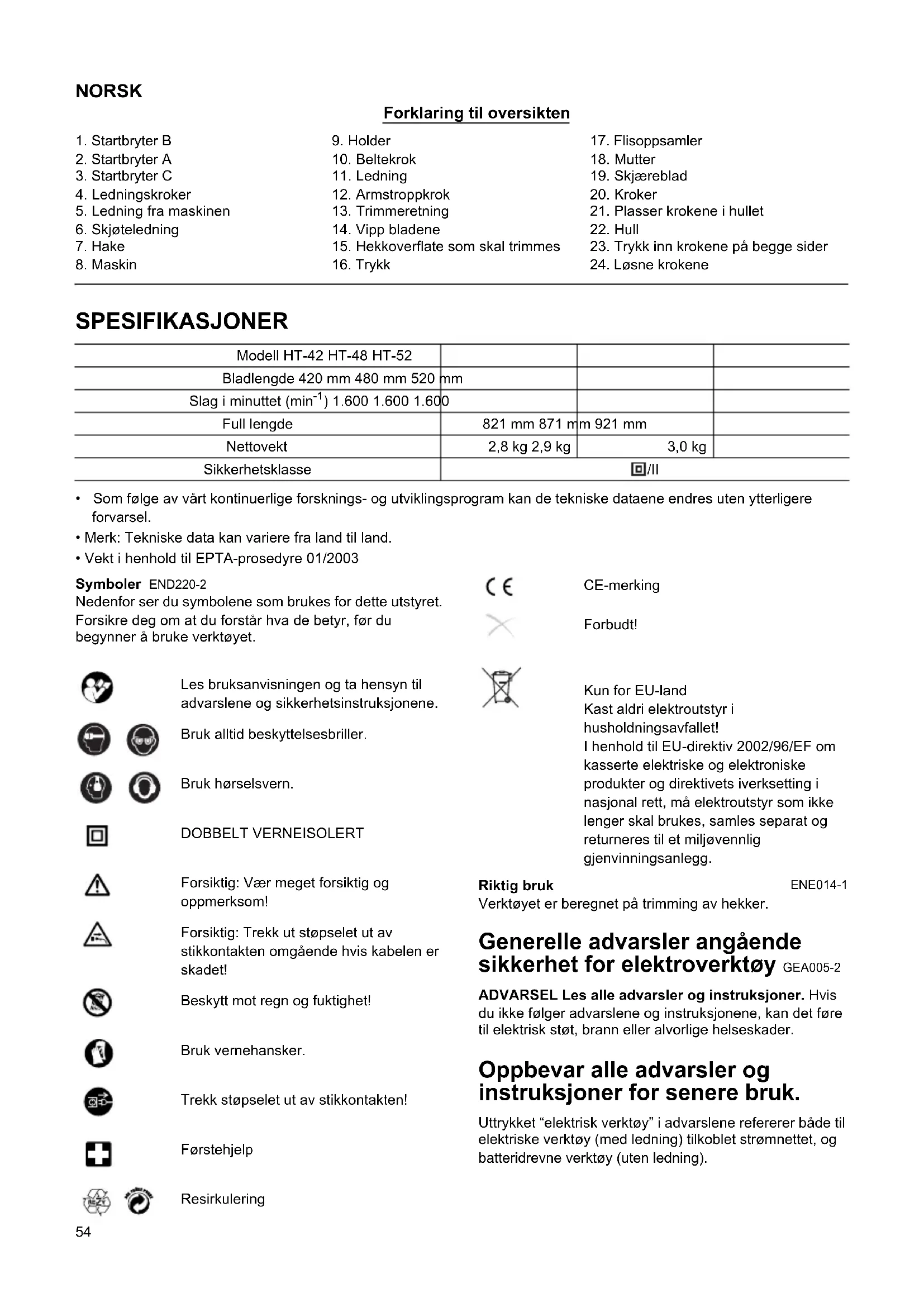 - Vekt i henhold til EPTA-prosedyre 01/2003 Symboler END220-2 Nedenfor ser du symbolene som brukes for dette utstyret. Forsikre deg om at du forstår hva de betyr, før du begynner å bruke verktøyet. Les bruksanvisningen og ta hensyn til advarslene og sikkerhetsinstruksjonene. Bruk alltid beskyttelsesbriller. Bruk hørselsvern. DOBBELT VERNEISOLERT Forsiktig: Vær meget forsiktig og oppmerksom! Forsiktig: Trekk ut støpselet ut av stikkontakten omgående hvis kabelen er skadet! Beskytt mot regn og fuktighet! Bruk vernehansker. Trekk støpselet ut av stikkontakten! Førstehjelp Resirkulering CE-merking Forbudt! Kun for EU-land Kast aldri elektroutstyr i husholdningsavfallet! I henhold til EU-direktiv 2002/96/EF om kasserte elektriske og elektroniske produkter og direktivets iverksetting i nasjonal rett, må elektroutstyr som ikke lenger skal brukes, samles separat og returneres til et miljøvennlig gjenvinningsanlegg. Riktig bruk ENE014-1 Verktøyet er beregnet på trimming av hekker. Generelle advarsler angående sikkerhet for elektroverktøy GEA005-2 ADVARSEL Les alle advarsler og instruksjoner. Hvis du ikke følger advarslene og instruksjonene, kan det føre til elektrisk støt, brann eller alvorlige helseskader. Oppbevar alle advarsler og instruksjoner for senere bruk. Uttrykket “elektrisk verktøy” i advarslene refererer både til elektriske verktøy (med ledning) tilkoblet strømnettet, og batteridrevne verktøy (uten ledning).