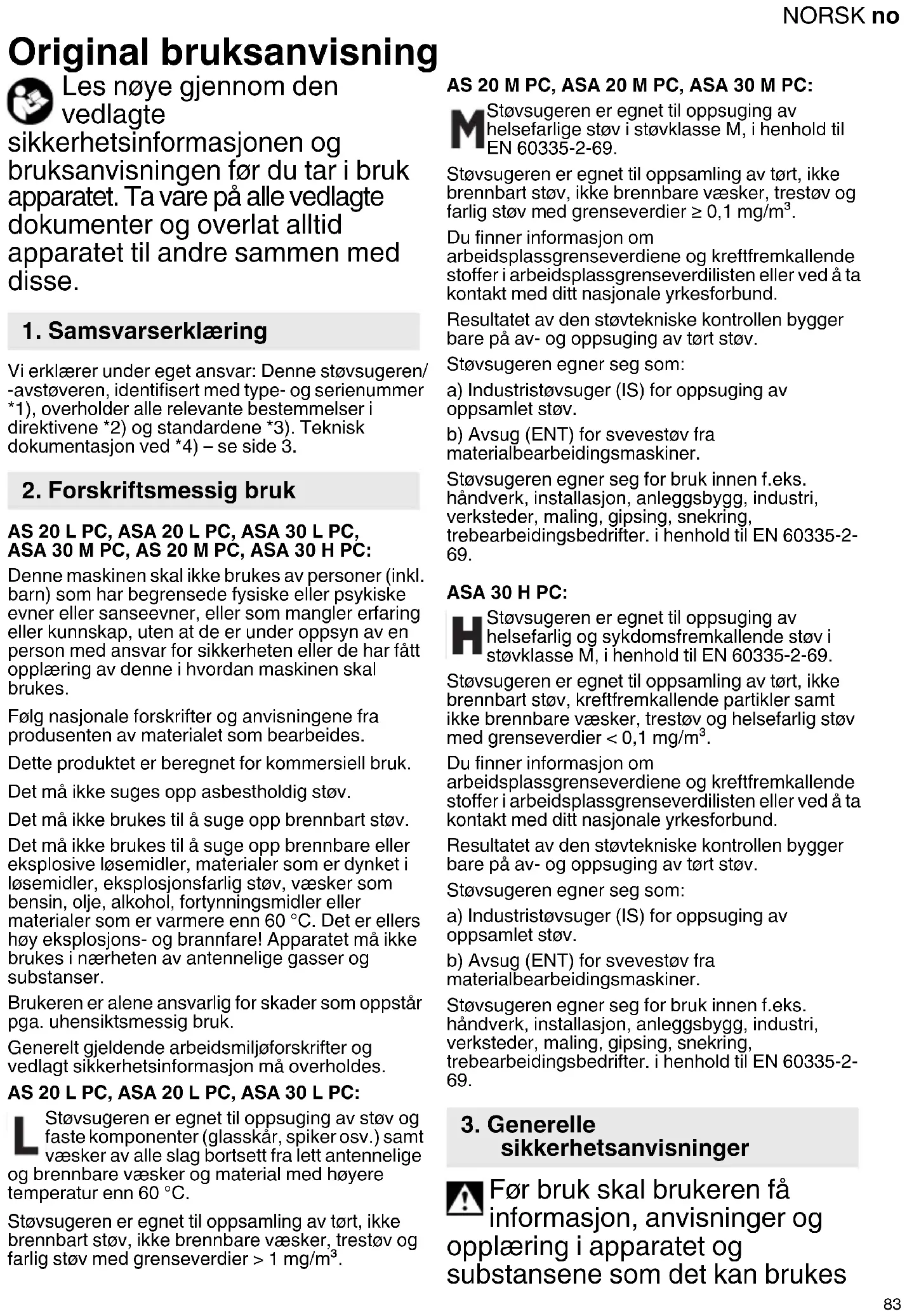 Original bruksanvisning Les nøye gjennom den vedlagte sikkerhetsinformasjonen og bruksanvisningen før du tar i bruk apparatet. Ta vare på alle vedlagte dokumenter og overlat alltid apparatet til andre sammen med disse. Vi erklærer under eget ansvar: Denne støvsugeren/ -avstøveren, identifisert med type- og serienummer *1), overholder alle relevante bestemmelser i direktivene *2) og standardene *3). Teknisk dokumentasjon ved *4) – se side 3. AS 20 L PC, ASA 20 L PC, ASA 30 L PC, ASA 30 M PC, AS 20 M PC, ASA 30 H PC: Denne maskinen skal ikke brukes av personer (inkl. barn) som har begrensede fysiske eller psykiske evner eller sanseevner, eller som mangler erfaring eller kunnskap, uten at de er under oppsyn av en person med ansvar for sikkerheten eller de har fått opplæring av denne i hvordan maskinen skal brukes. Følg nasjonale forskrifter og anvisningene fra produsenten av materialet som bearbeides. Dette produktet er beregnet for kommersiell bruk. Det må ikke suges opp asbestholdig støv. Det må ikke brukes til å suge opp brennbart støv. Det må ikke brukes til å suge opp brennbare eller eksplosive løsemidler, materialer som er dynket i løsemidler, eksplosjonsfarlig støv, væsker som bensin, olje, alkohol, fortynningsmidler eller materialer som er varmere enn 60 °C. Det er ellers høy eksplosjons- og brannfare! Apparatet må ikke brukes i nærheten av antennelige gasser og substanser. Brukeren er alene ansvarlig for skader som oppstår pga. uhensiktsmessig bruk. Generelt gjeldende arbeidsmiljøforskrifter og vedlagt sikkerhetsinformasjon må overholdes. AS 20 L PC, ASA 20 L PC, ASA 30 L PC: Støvsugeren er egnet til oppsuging av støv og faste komponenter (glasskår, spiker osv.) samt væsker av alle slag bortsett fra lett antennelige og brennbare væsker og material med høyere temperatur enn 60 °C. Støvsugeren er egnet til oppsamling av tørt, ikke brennbart støv, ikke brennbare væsker, trestøv og farlig støv med grenseverdier > 1 mg/m³. AS 20 M PC, ASA 20 M PC, ASA 30 M PC: Støvsugeren er egnet til oppsuging av helsefarlige støv i støvklasse M, i henhold til EN 60335-2-69. Støvsugeren er egnet til oppsamling av tørt, ikke brennbart støv, ikke brennbare væsker, trestøv og farlig støv med grenseverdier ≥ 0,1 mg/m³. Du finner informasjon om arbeidsplassgrenseverdiene og kreftfremkallende stoffer i arbeidsplassgrenseverdilisten eller ved å ta kontakt med ditt nasjonale yrkesforbund. Resultatet av den støvtekniske kontrollen bygger bare på av- og oppsuging av tørt støv. Støvsugeren egner seg som: a) Industristøvsuger (IS) for oppsuging av oppsamlet støv. b) Avsug (ENT) for svevestøv fra materialbearbeidingsmaskiner. Støvsugeren egner seg for bruk innen f.eks. håndverk, installasjon, anleggsbygg, industri, verksteder, maling, gipsing, snekring, trebearbeidingsbedrifter. i henhold til EN 60335-2-