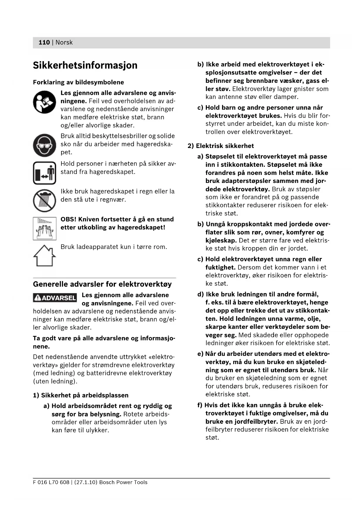 a) Støpselet til elektroverktøyet må passe inn i stikkontakten. Støpselet må ikke forandres på noen som helst måte. Ikke bruk adapterstøpsler sammen med jor- dede elektroverktøy. Bruk av støpsler som ikke er forandret på og passende stikkontakter reduserer risikoen for elek- triske støt. b) Unngå kroppskontakt med jordede over- flater slik som rør, ovner, komfyrer og kjøleskap. Det er større fare ved elektris- ke støt hvis kroppen din er jordet. c) Hold elektroverktøyet unna regn eller fuktighet. Dersom det kommer vann i et elektroverktøy, øker risikoen for elektris- ke støt. d) Ikke bruk ledningen til andre formål, f. eks. til å bære elektroverktøyet, henge det opp eller trekke det ut av stikkontak- ten. Hold ledningen unna varme, olje, skarpe kanter eller verktøydeler som be- veger seg. Med skadede eller opphopede ledninger øker risikoen for elektriske støt. e) Når du arbeider utendørs med et elektro- verktøy, må du kun bruke en skjøteled- ning som er egnet til utendørs bruk. Når du bruker en skjøteledning som er egnet for utendørs bruk, reduseres risikoen for elektriske støt. f) Hvis det ikke kan unngås å bruke elek- troverktøyet i fuktige omgivelser, må du bruke en jordfeilbryter. Bruk av en jord- feilbryter reduserer risikoen for elektriske støt. ADVARSEL OBJ_BUCH-1077-002.book Page 110 Wednesday, January 27, 2010 4:40 PMNorsk | 111 Bosch Power Tools F 016 L70 608 | (27.1.10)