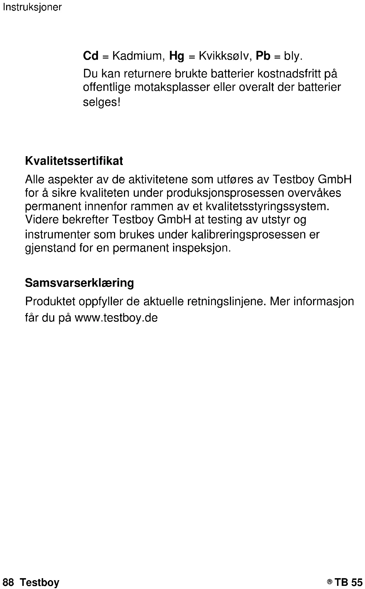 Garantikrav bortfaller I tilfeller der skader forårsakes av manglende etterlevelse av instruksene I dette heftet. Vi tar intet ansvar for denne type skader. Testboy er ikke ansvarlig for skader som følge av: | Manglende etterlevelse av instruksjonene. | Endringer på produktet som ikke er godkjent av Testboy | Bruk av reservedeler som ikke er godkjent av Testboy | Bruk av alkohol, narkotika eller medisiner.Instruksjoner 88 Testboy