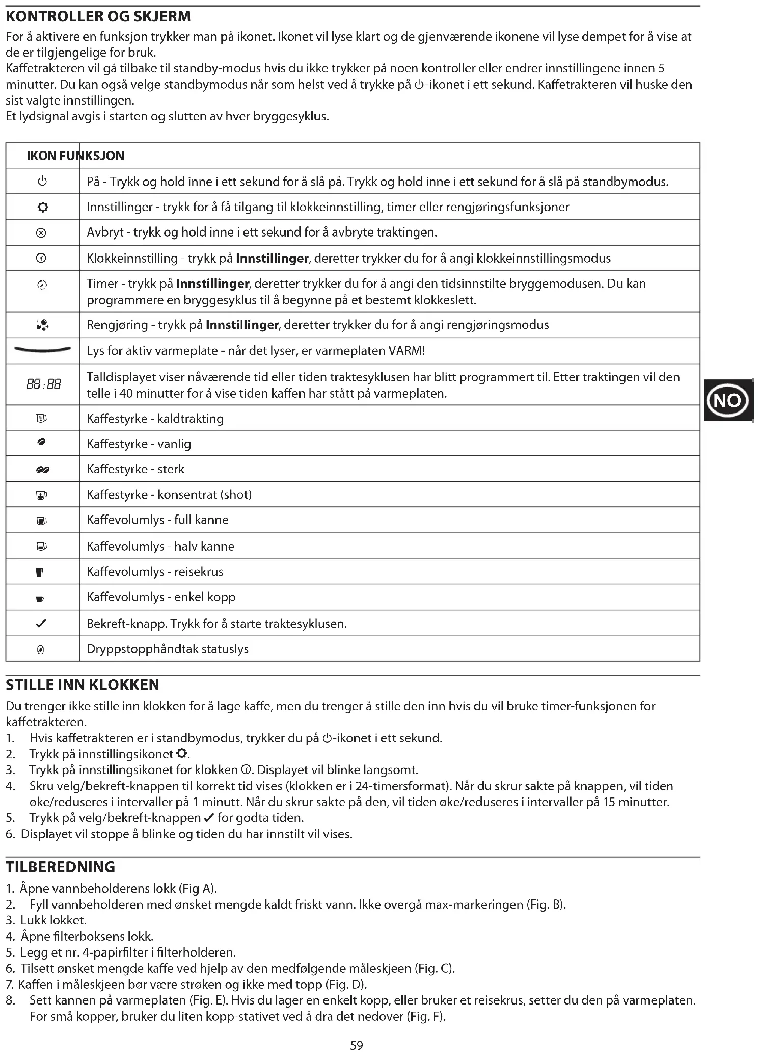 For å aktivere en funksjon trykker man på ikonet. Ikonet vil lyse klart og de gjenværende ikonene vil lyse dempet for å vise at de er tilgjengelige for bruk. Kaffetrakteren vil gå tilbake til standby-modus hvis du ikke trykker på noen kontroller eller endrer innstillingene innen 5 minutter. Du kan også velge standbymodus når som helst ved å trykke på C-ikonet i ett sekund. Kaffetrakteren vil huske den sist valgte innstillingen. Et lydsignal avgis i starten og slutten av hver bryggesyklus. IKON FUNKSJON