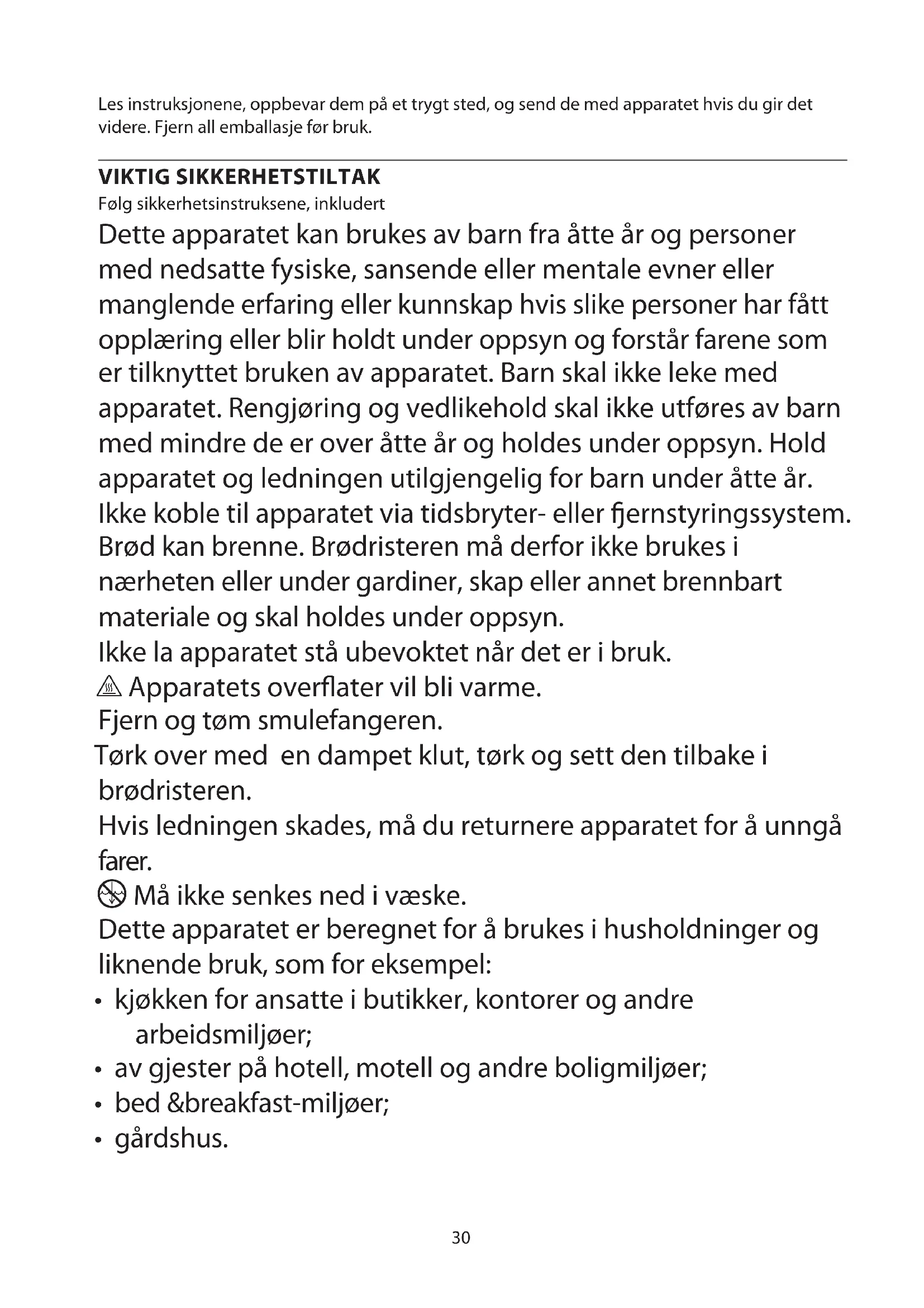 AE30 Les instruksjonene, oppbevar dem på et trygt sted, og send de med apparatet hvis du gir det videre. Fjern all emballasje før bruk. VIKTIG SIKKERHETSTILTAK Følg sikkerhetsinstruksene, inkludert Dette apparatet kan brukes av barn fra åtte år og personer med nedsatte fysiske, sansende eller mentale evner eller manglende erfaring eller kunnskap hvis slike personer har fått opplæring eller blir holdt under oppsyn og forstår farene som er tilknyttet bruken av apparatet. Barn skal ikke leke med apparatet. Rengjøring og vedlikehold skal ikke utføres av barn med mindre de er over åtte år og holdes under oppsyn. Hold apparatet og ledningen utilgjengelig for barn under åtte år. Ikke koble til apparatet via tidsbryter- eller ernstyringssystem. Brød kan brenne. Brødristeren må derfor ikke brukes i nærheten eller under gardiner, skap eller annet brennbart materiale og skal holdes under oppsyn. Ikke la apparatet stå ubevoktet når det er i bruk. h Apparatets overflater vil bli varme. Fjern og tøm smulefangeren. Tørk over med en dampet klut, tørk og sett den tilbake i brødristeren. Hvis ledningen skades, må du returnere apparatet for å unngå farer. i Må ikke senkes ned i væske. Dette apparatet er beregnet for å brukes i husholdninger og liknende bruk, som for eksempel: