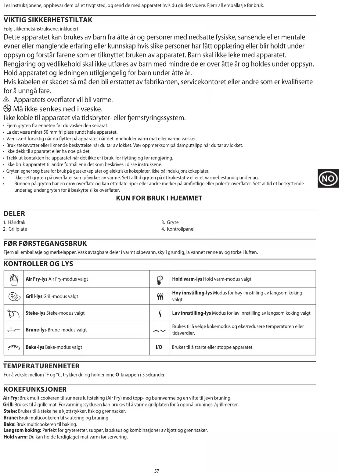 - Fjern gryten fra enheten før du vasker den separat.• La det være minst 50 mm fri plass rundt hele apparatet.• Vær svært forsiktig når du flytter på apparatet når det inneholder varm mat eller varme væsker.• Bruk stekevotter eller liknende beskyttelse når du tar av lokket. Vær oppmerksom på damputslipp når du tar av lokket.• Ikke dekk til apparatet eller ha noe på det. • Trekk ut kontakten fra apparatet når det ikke er i bruk, før flytting og før rengjøring. • Ikke bruk apparatet til andre formål enn det som beskrives i disse instruksene. • Gryten egner seg bare for bruk på gasskokeplater og elektriske kokeplater, ikke på induksjonskokeplater.
