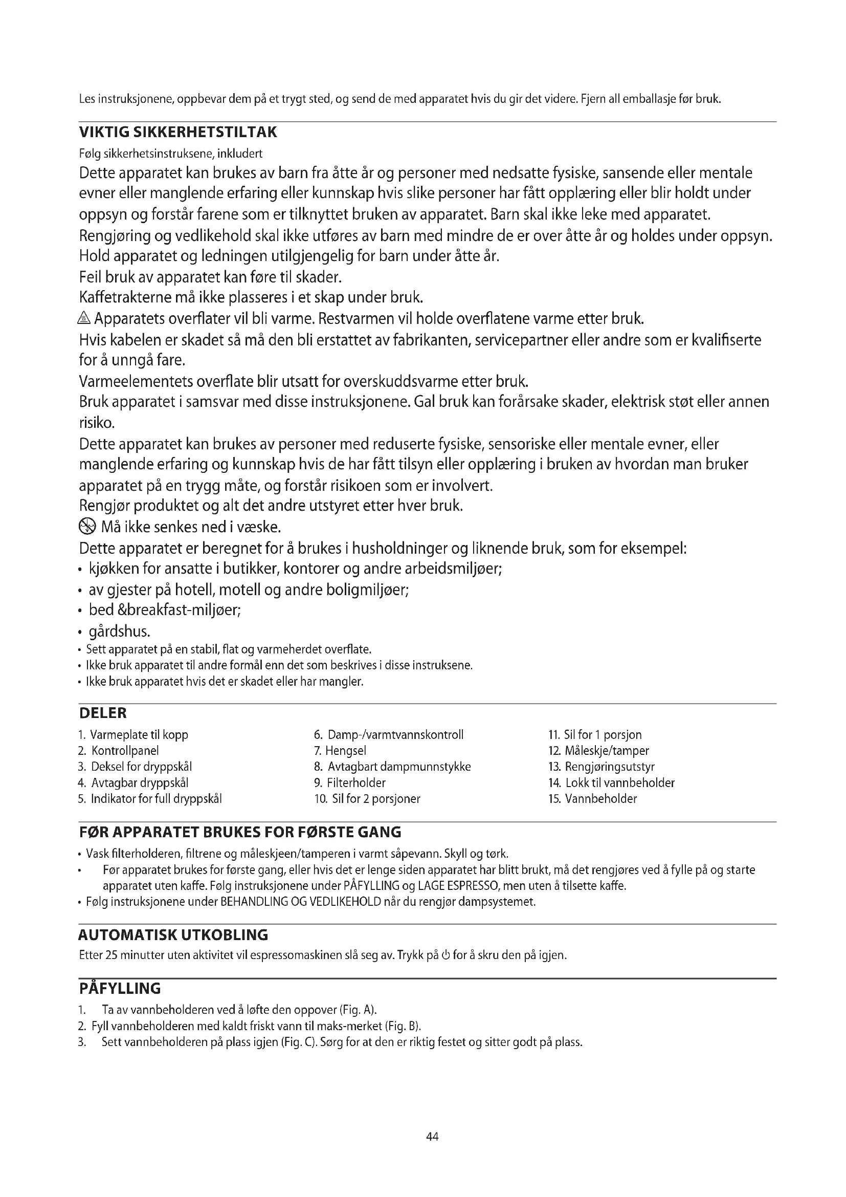AE44 Les instruksjonene, oppbevar dem på et trygt sted, og send de med apparatet hvis du gir det videre. Fjern all emballasje før bruk. VIKTIG SIKKERHETSTILTAK Følg sikkerhetsinstruksene, inkludert Dette apparatet kan brukes av barn fra åtte år og personer med nedsatte fysiske, sansende eller mentale evner eller manglende erfaring eller kunnskap hvis slike personer har fått opplæring eller blir holdt under oppsyn og forstår farene som er tilknyttet bruken av apparatet. Barn skal ikke leke med apparatet. Rengjøring og vedlikehold skal ikke utføres av barn med mindre de er over åtte år og holdes under oppsyn. Hold apparatet og ledningen utilgjengelig for barn under åtte år. Feil bruk av apparatet kan føre til skader. Kaffetrakterne må ikke plasseres i et skap under bruk. h Apparatets overflater vil bli varme. Restvarmen vil holde overflatene varme etter bruk. Hvis kabelen er skadet så må den bli erstattet av fabrikanten, servicepartner eller andre som er kvalifiserte for å unngå fare. Varmeelementets overflate blir utsatt for overskuddsvarme etter bruk. Bruk apparatet i samsvar med disse instruksjonene. Gal bruk kan forårsake skader, elektrisk støt eller annen risiko. Dette apparatet kan brukes av personer med reduserte fysiske, sensoriske eller mentale evner, eller manglende erfaring og kunnskap hvis de har fått tilsyn eller opplæring i bruken av hvordan man bruker apparatet på en trygg måte, og forstår risikoen som er involvert. Rengjør produktet og alt det andre utstyret etter hver bruk.