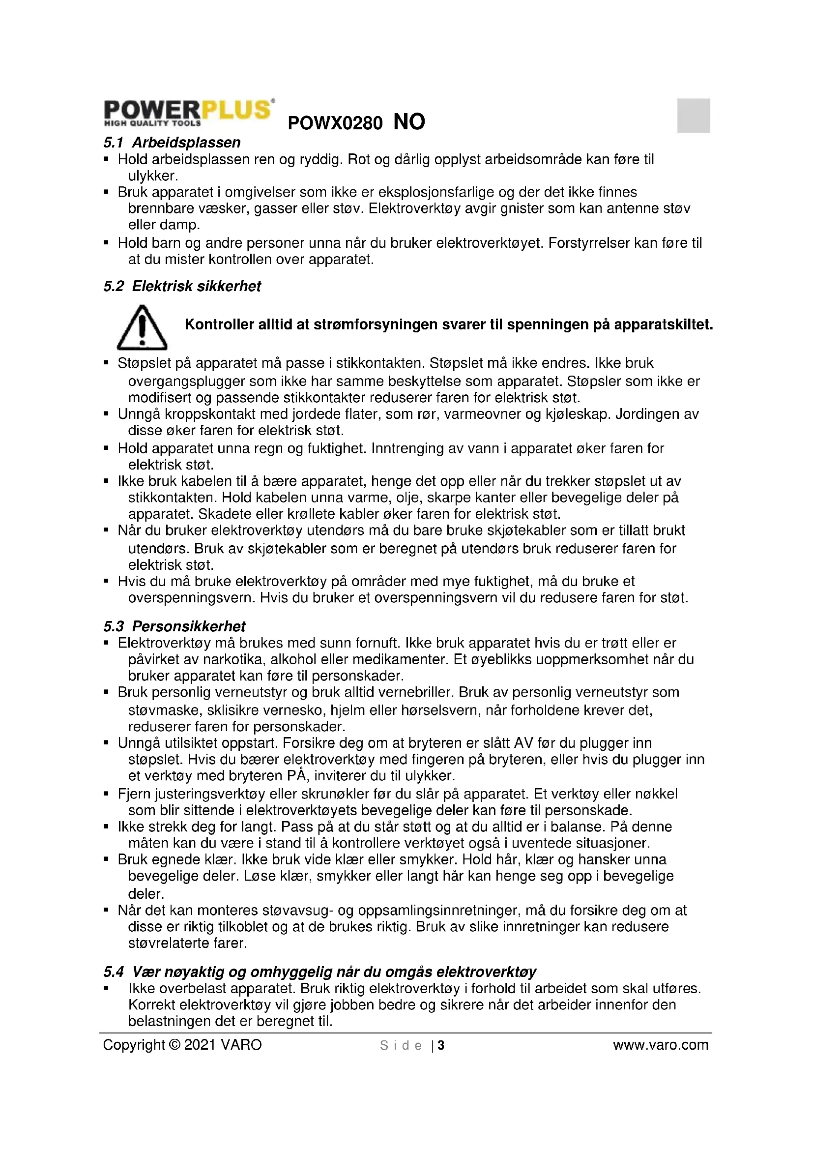 - Ikke overbelast apparatet. Bruk riktig elektroverktøy i forhold til arbeidet som skal utføres. Korrekt elektroverktøy vil gjøre jobben bedre og sikrere når det arbeider innenfor den belastningen det er beregnet til.POWX0280 NO Copyright © 2021 VARO S i d e | 4 www.varo.com
