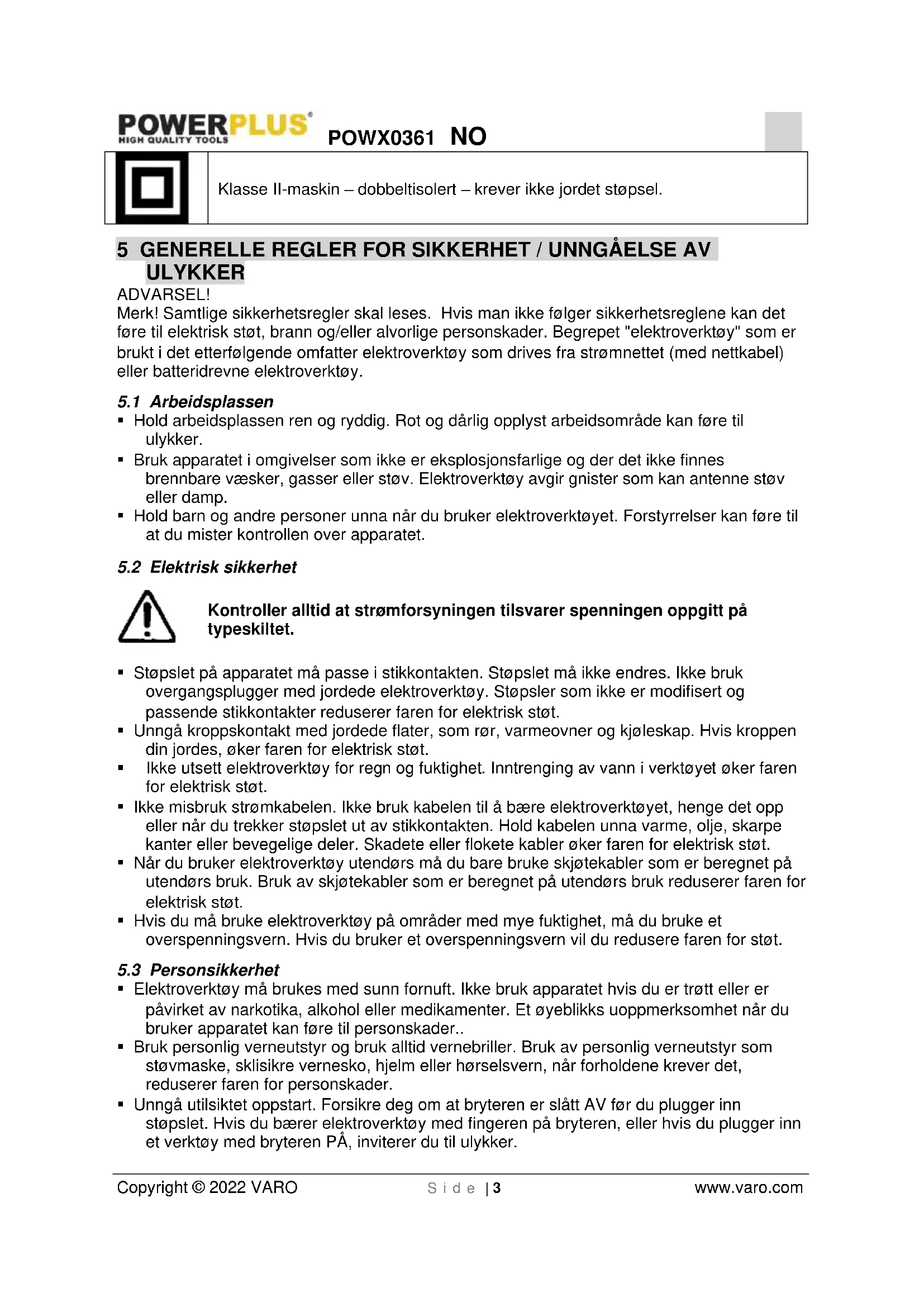 - Unngå utilsiktet oppstart. Forsikre deg om at bryteren er slått AV før du plugger inn støpslet. Hvis du bærer elektroverktøy med fingeren på bryteren, eller hvis du plugger inn et verktøy med bryteren PÅ, inviterer du til ulykker.POWX0361 NO Copyright © 2022 VARO S i d e | 4 www.varo.com