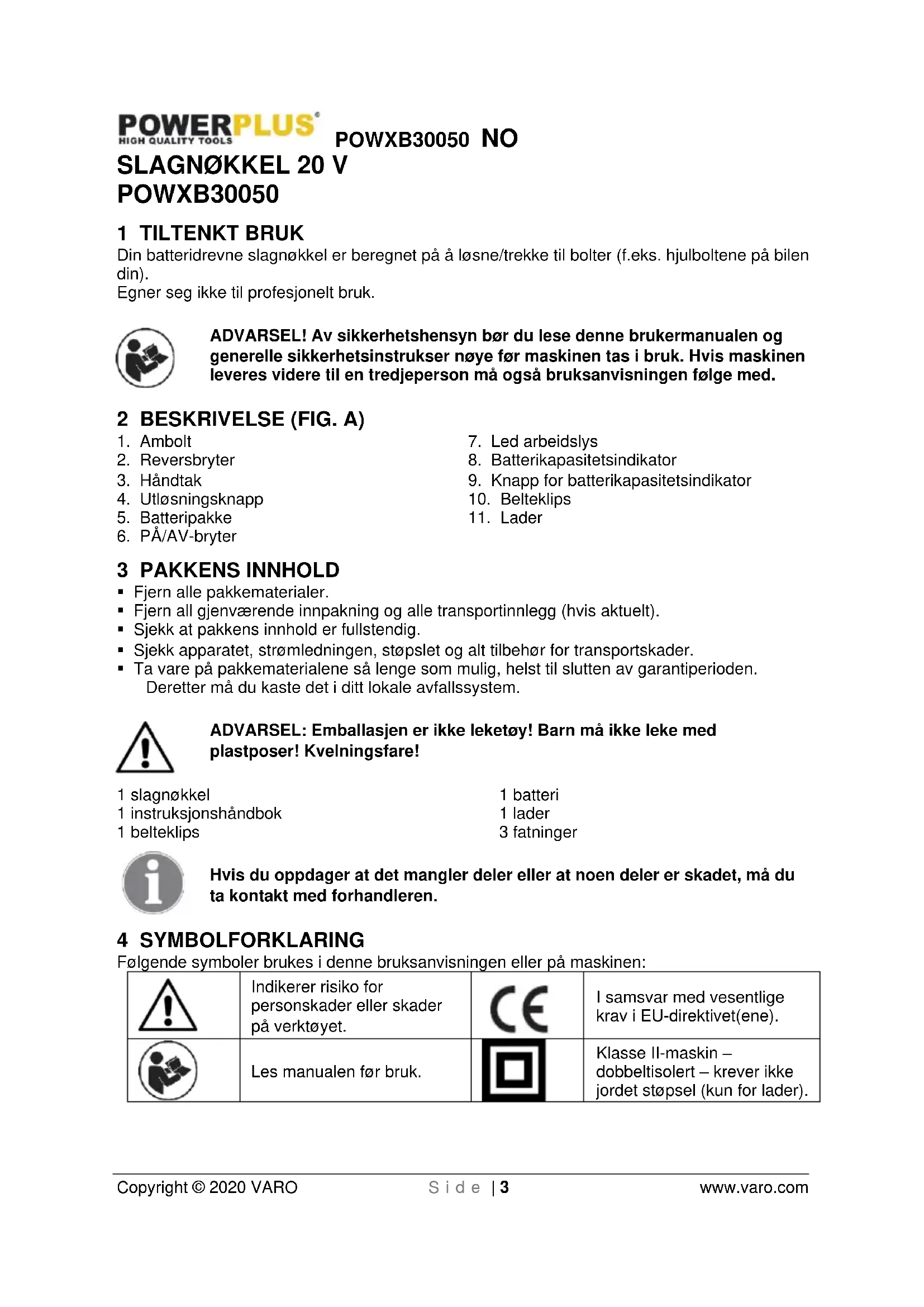 - Verktøyet må lades opp minst én gang per måned for å sikre optimal funksjon. 13 MILJØ Hvis maskinen må skiftes ut etter lang tids bruk, må den ikke kastes sammen med husholdningsavfallet. Kast den på en miljøvennlig måte. Avfall produsert av elektriske maskiner bør ikke bli behandlet som normalt husholdningsavfall. Sørg for å resirkulere der hvor spesialanlegg eksisterer. Be lokale myndigheter eller forhandler om råd angående tømming og resirkulering.POWXB30050 DA Copyright © 2020 VARO S i d e | 1 www.varo.com 1 TILSIGTET BRUG ........................................................................... 3