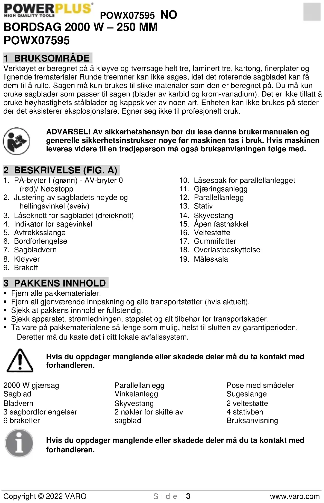 - Ta vare på pakkematerialene så lenge som mulig, helst til slutten av garantiperioden. Deretter må du kaste det i ditt lokale avfallssystem. Hvis du oppdager manglende eller skadede deler må du ta kontakt med forhandleren. 2000 W gjærsag Sagblad Bladvern 3 sagbordforlengelser 6 braketter Parallellanlegg Vinkelanlegg Skyvestang 2 nøkler for skifte av sagblad Pose med smådeler Sugeslange 2 veltestøtte 4 stativben Bruksanvisning Hvis du oppdager manglende eller skadede deler må du ta kontakt med forhandleren.POWX07595 NO Copyright © 2022 VARO S i d e | 4 www.varo.com 4 EKSTRA SIKKERHETSINSTRUKSJONER