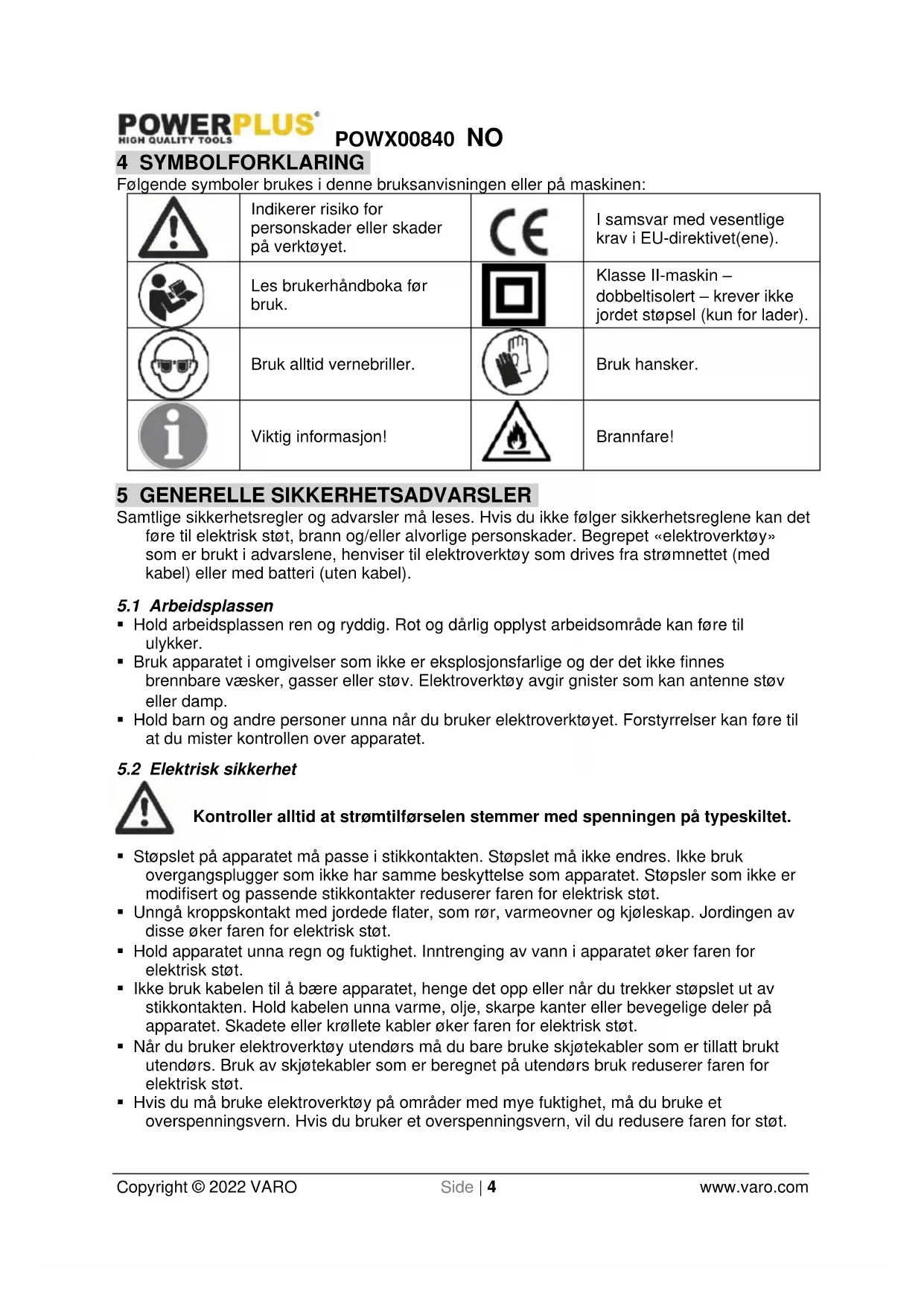 - Hvis du må bruke elektroverktøy på områder med mye fuktighet, må du bruke et overspenningsvern. Hvis du bruker et overspenningsvern, vil du redusere faren for støt.POWX00840 NO Copyright © 2022 VARO Side | 5 www.varo.com