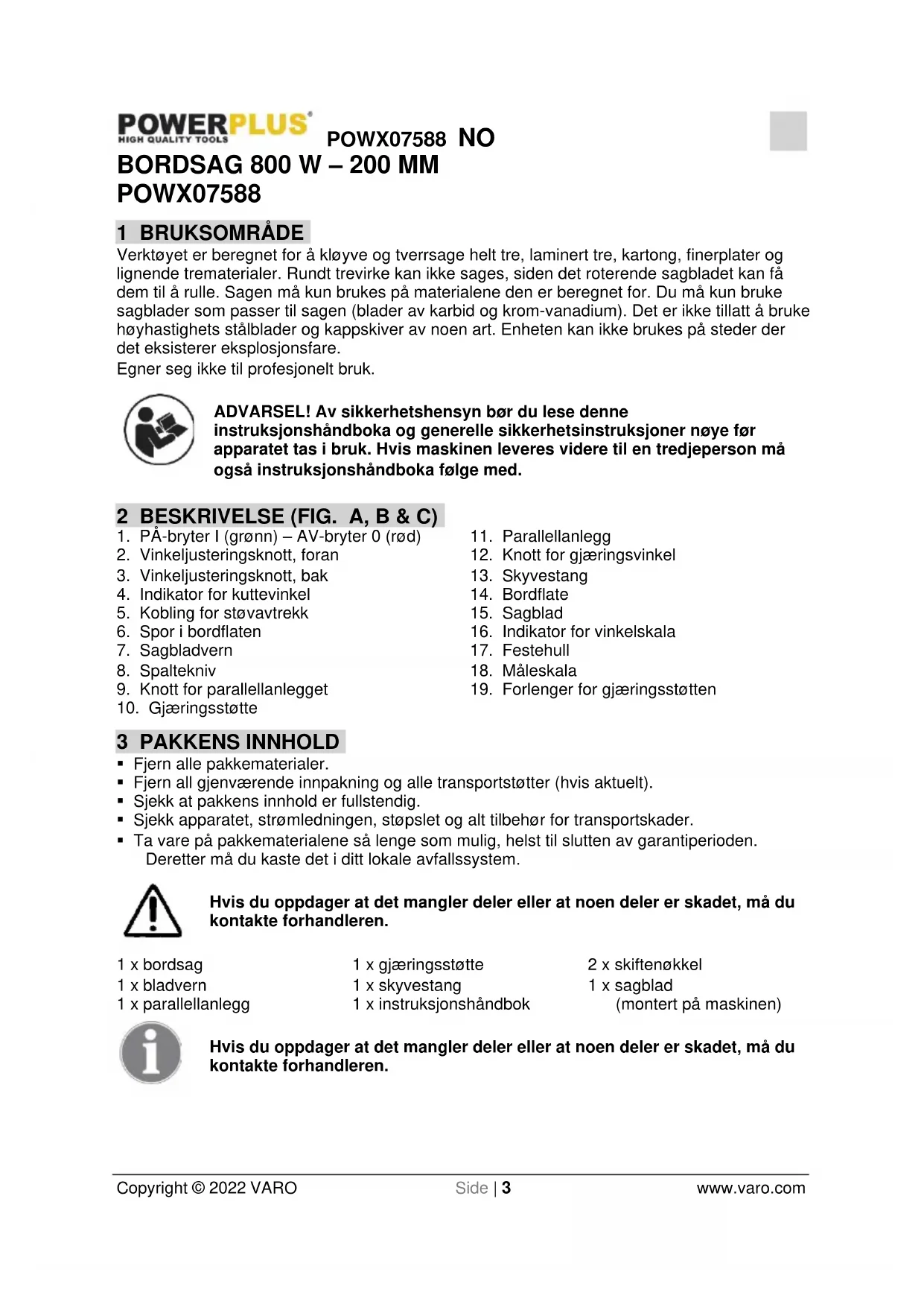 Fare for personskade! Oppbevar sagen slik at den ikke kan startes av uautoriserte personer. Påse at ingen kan skade seg på enheten der den oppbevares. Skade på sagen! Må ikke oppbevares ubeskyttet på et fuktig sted.POWX07588 NO Copyright © 2022 VARO Side | 12 www.varo.com 12 TEKNISKE DATA Nominell spenning 230–240 V Nominell frekvens 50 Hz Nominell strøm S1:500 W S6 15% 800 W Vekt 11,00 kg Beskyttelsesklasse