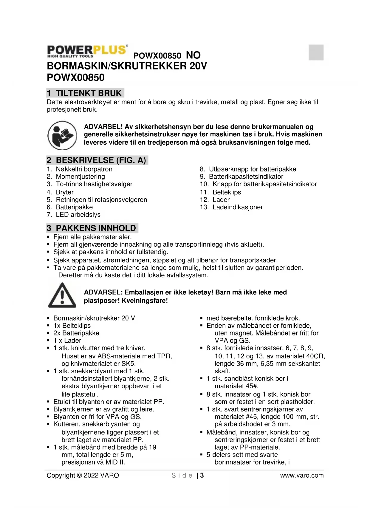 - La bare kvalifiserte fagfolk reparere elektroverktøyet, og bruk bare originale reservedeler. På denne måten kan du være sikker på at verktøyet er sikkert å bruke.POWX00850 NO Copyright © 2022 VARO S i d e | 7 www.varo.com