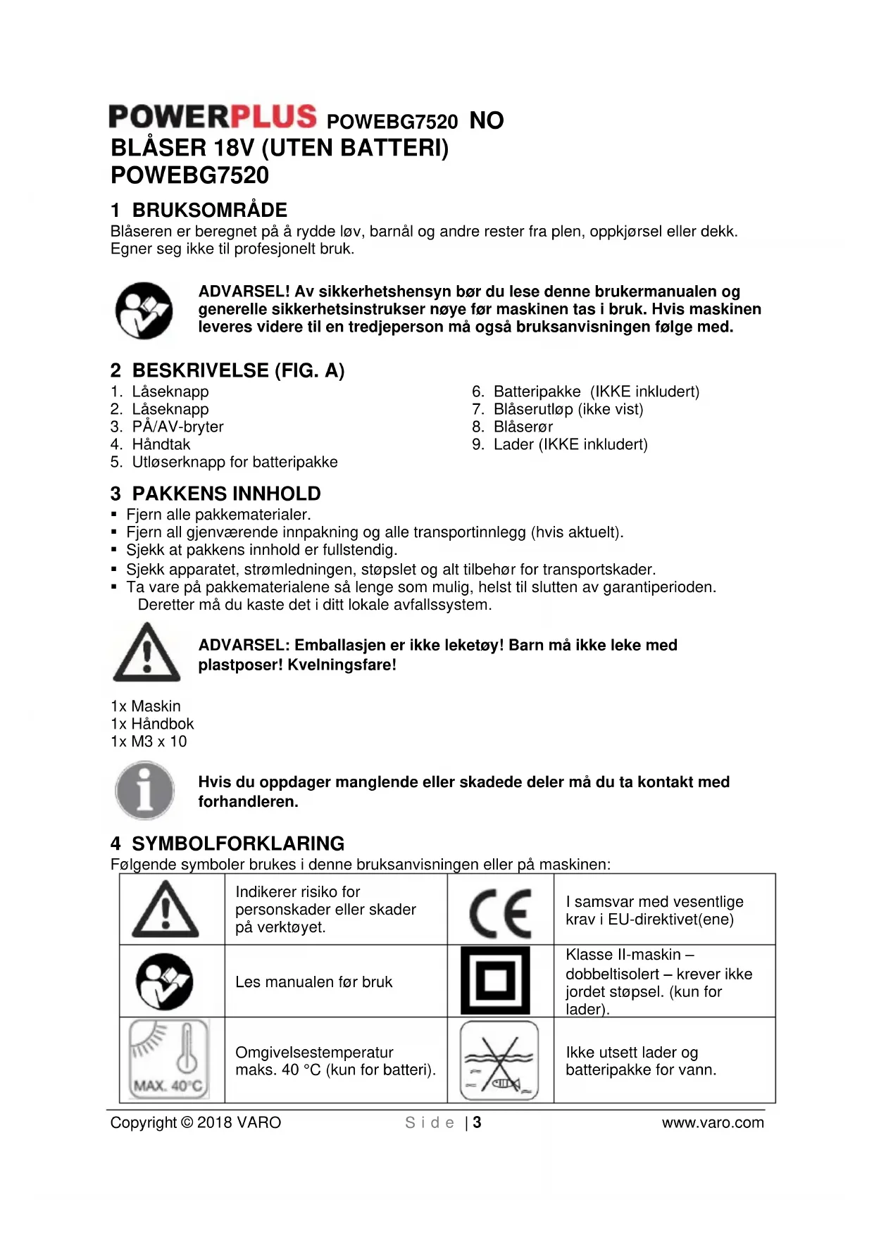 - Garantien dekker ikke skader som skyldes manglende vedlikehold eller overbelastning.POWEBG7520 NO Copyright © 2018 VARO S i d e | 9 www.varo.com