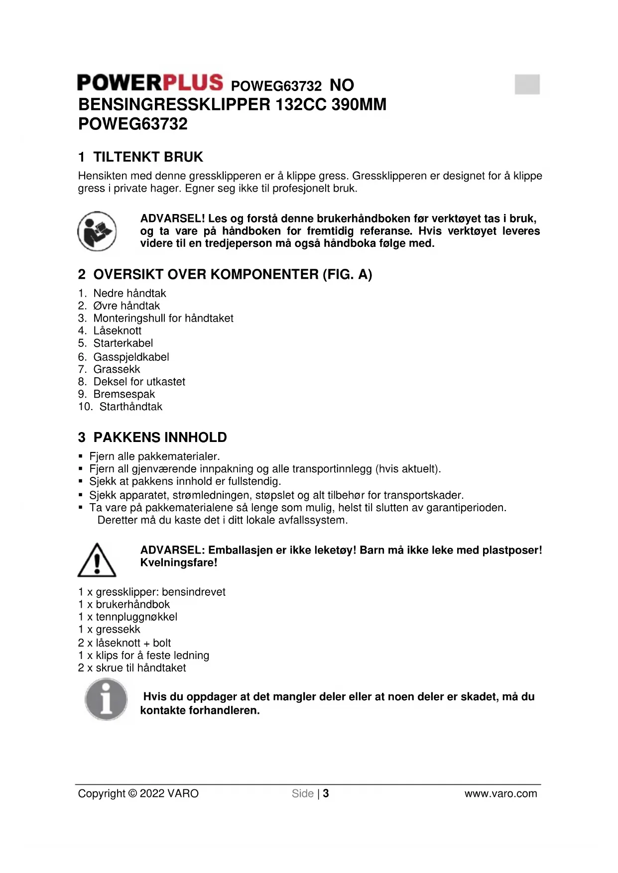 - Løsne alle kniv- og drivkoblinger før du starter motoren.POWEG63732 NO Copyright © 2022 VARO Side | 7 www.varo.com