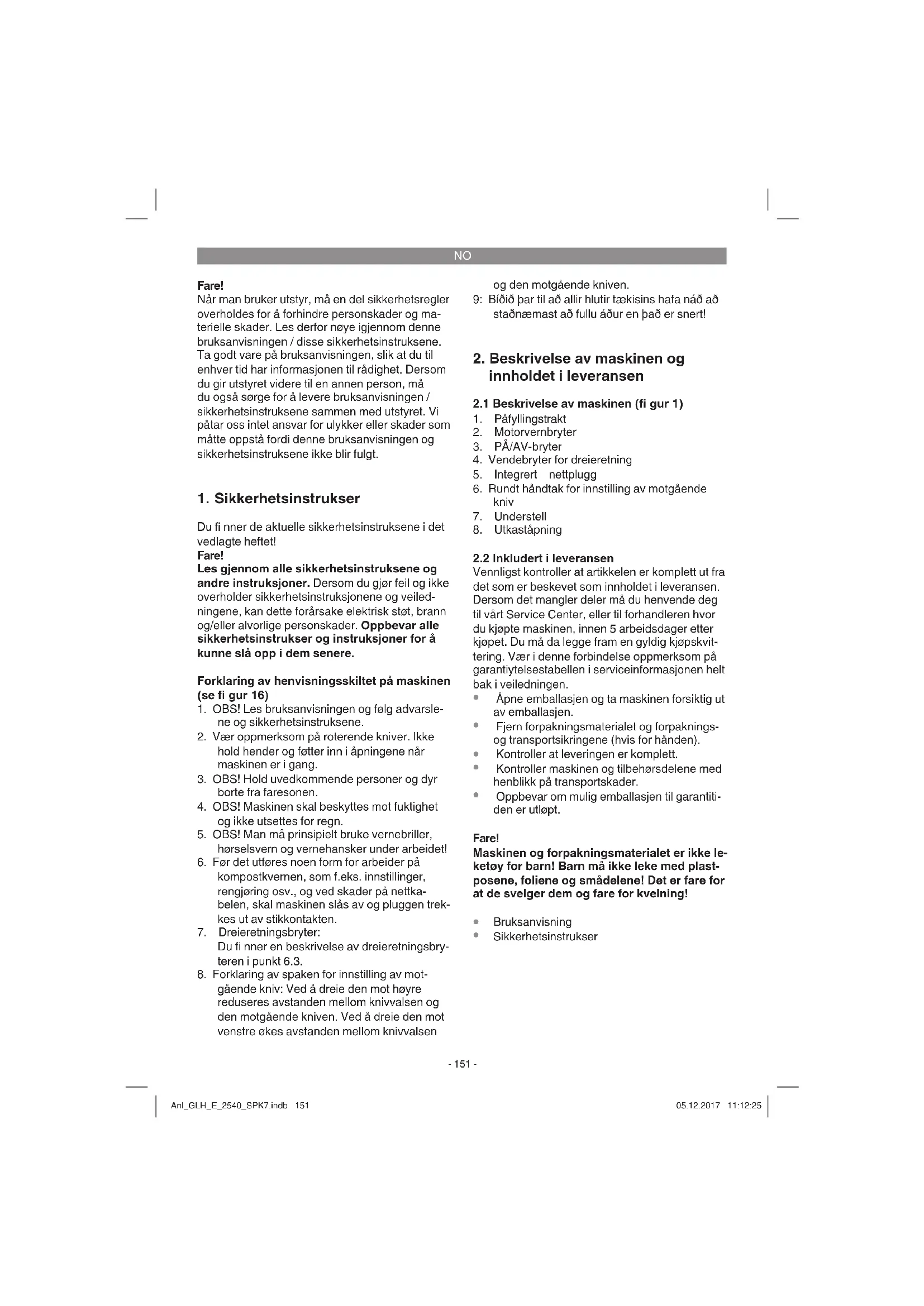Kun for EU-land Ikke kast elektroverktøy i husholdningsavfallet! I henhold til EU-direktiv 2012/19/EF om utbrukt elektro- og elektronisk utstyr og gjennomføring i nasjonal lovgivning må utbrukt elektroverktøy samles inn separat og tilføres miljøvennlig gjenvinning. Recycling-alternativ til oppfordring om returnering: Eieren av elektroutstyret er alternativt forpliktet til å være med og sørge for at utstyret blir tilført en fors- kriftsmessig gjenvinning i stedet for returnering, når vedkommende vil kvitte seg med det. Det gamle utstyret kan i denne forbindelse også leveres til et returdeponi, som gjennomfører en destruksjon i samsvar med gjeldende nasjonale lover om resirkulering og avfall. De tilbehørsdeler og hjelpemidler uten elektobestanddeler som fulgte med utstyret, berøres ikke av dette. Gjentrykk eller annen mangfoldiggjøring av dokumentasjon og ledsagende papirer til produktene, også i utdrag, er bare tillatt når ISC GmbH har gitt sitt uttrykkelige samtykke til dette. Med forbehold om tekniske endringer Ved ugunstige nettforhold kan maskinen føre til forbigående spenningsreduksjon. Dersom nettimpedans Z i tilkoplingspunktet mot det off entlige nettet er større enn 0,329 Ω, kan det være nødvendig med ytterli- gere tiltak før maskinen kan brukes på forskriftsmessig måte tilkoplet denne tilkoplingen. Om nødvendig kan du innhente informasjon om impedansen hos din kraftleverandør. Anl_GLH_E_2540_SPK7.indb 156Anl_GLH_E_2540_SPK7.indb 156 05.12.2017 11:12:2505.12.2017 11:12:25NO
