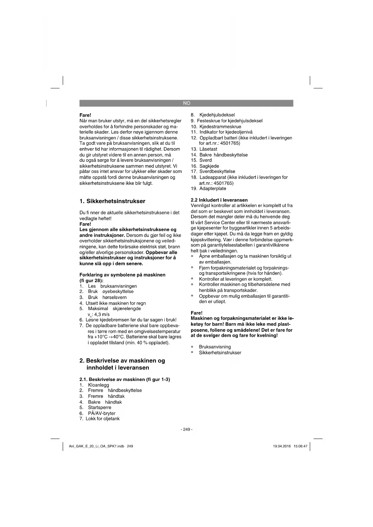 Utgangsspenning ladeapparat: ..............21 V d.c. Utgangsstrøm ladeapparat: ............................3 A Nettspenning ladeapparat: . 200-250V~ 50-60Hz Batteritype: .................................................. li-Ion Sverdlengde ........................................... 250 mm Skjærelengde, maks.: ............................ 230 mm Skjærehastighet ved nominelt turtall: .......4,3 m/s Volum på oljetank: .....................................200 ml Vekt med sverd + kjede + batteri: ........ ca. 3,6 kg Fare! Støy og vibrasjoner Støy- og vibrasjonsverdiene ble målt i samsvar med EN 60745-1; EN 60745-2-13. Lydtrykknivå L