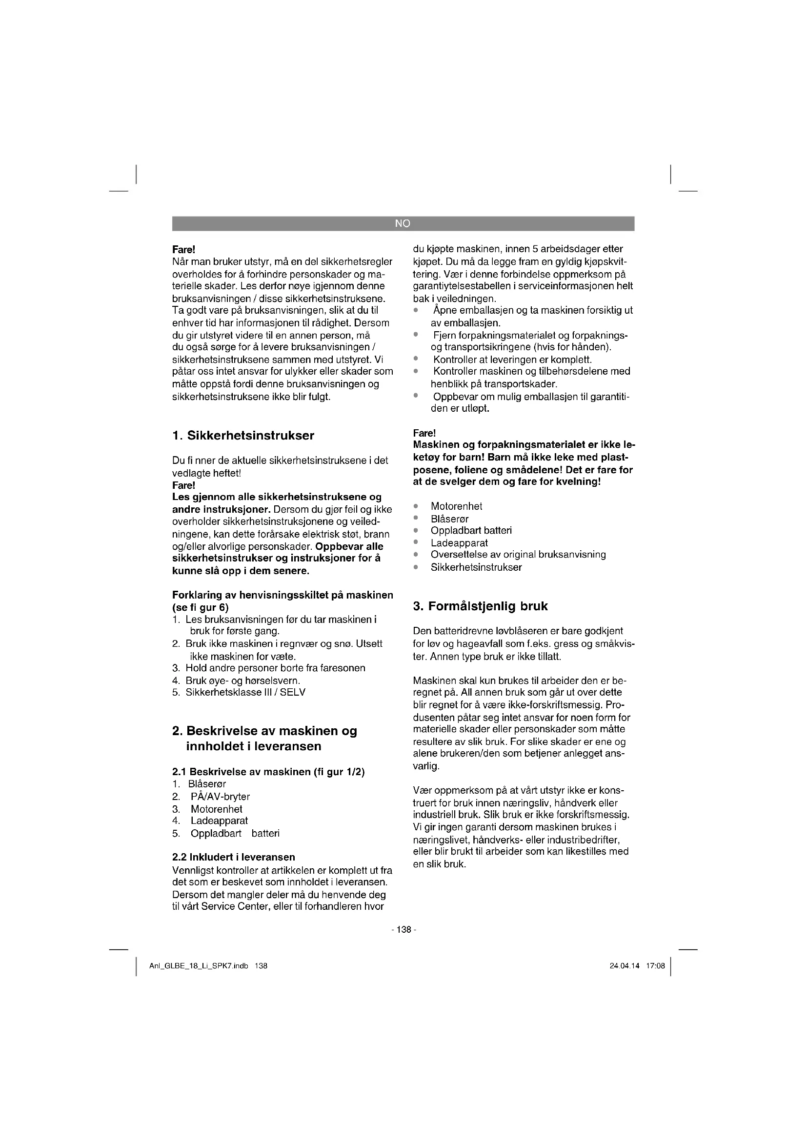 Den batteridrevne løvblåseren er bare godkjent for løv og hageavfall som f.eks. gress og småkvis- ter. Annen type bruk er ikke tillatt. Maskinen skal kun brukes til arbeider den er be- regnet på. All annen bruk som går ut over dette blir regnet for å være ikke-forskriftsmessig. Pro- dusenten påtar seg intet ansvar for noen form for materielle skader eller personskader som måtte resultere av slik bruk. For slike skader er ene og alene brukeren/den som betjener anlegget ans- varlig. Vær oppmerksom på at vårt utstyr ikke er kons- truert for bruk innen næringsliv, håndverk eller industriell bruk. Slik bruk er ikke forskriftsmessig. Vi gir ingen garanti dersom maskinen brukes i næringslivet, håndverks- eller industribedrifter, eller blir brukt til arbeider som kan likestilles med en slik bruk. Anl_GLBE_18_Li_SPK7.indb 138Anl_GLBE_18_Li_SPK7.indb 138 24.04.14 17:0824.04.14 17:08NO